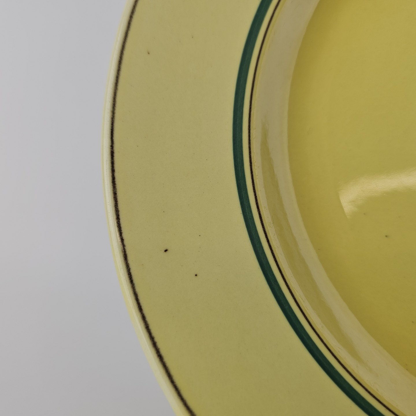 Fajancestel i stelform C med dekoration i gule nuancer med grøn stribe.