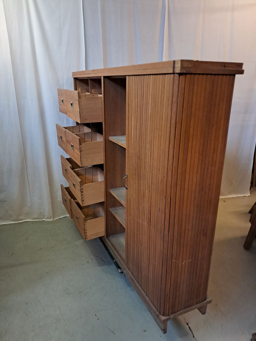 Jalousiskab i fineret egetræ, fra 1950erne.