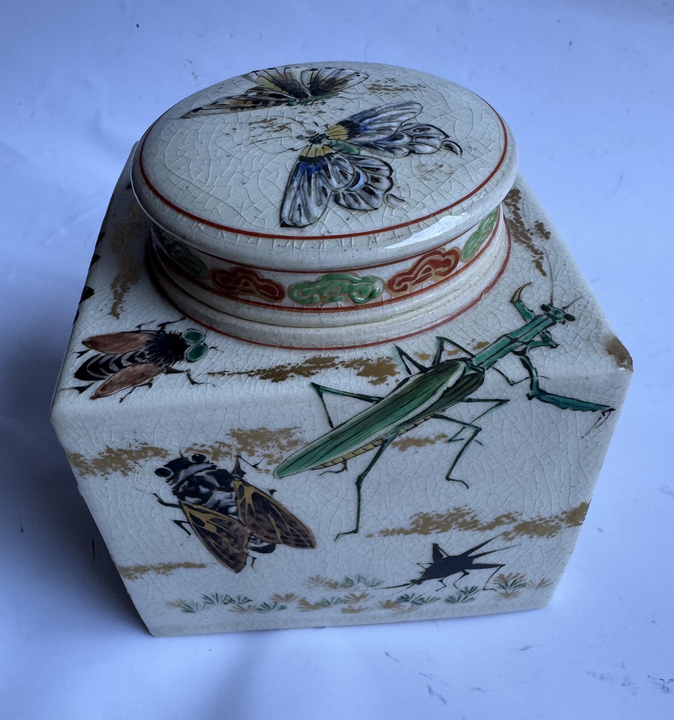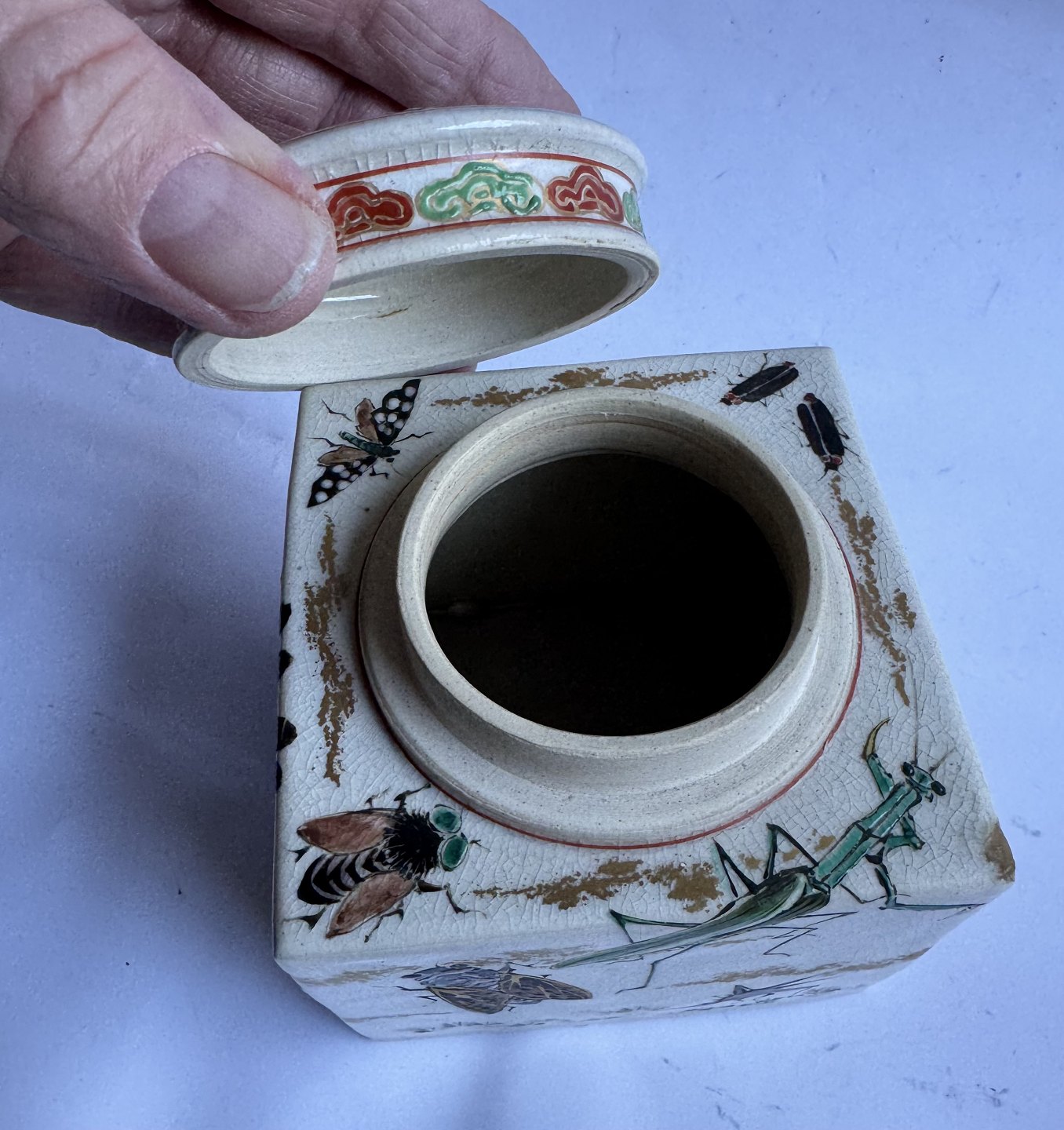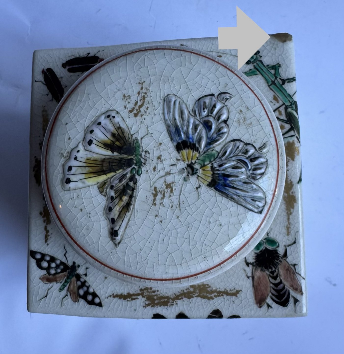 Firkantet tedåse i fajance fra Japan produceret omkring 1910. Smukt dekoreret med insekter i emalje, bl.a. sommerfugle og guldsmed, på alle sider samt på låget. Ubekendt fabriksmærke indstemplet på bunden. Ud over et lille skrab på et hjørne (følg de grå pile) er der intet at bemærke. Mål: H. 10,7 cm samt 9,5 x 9,5 cm.