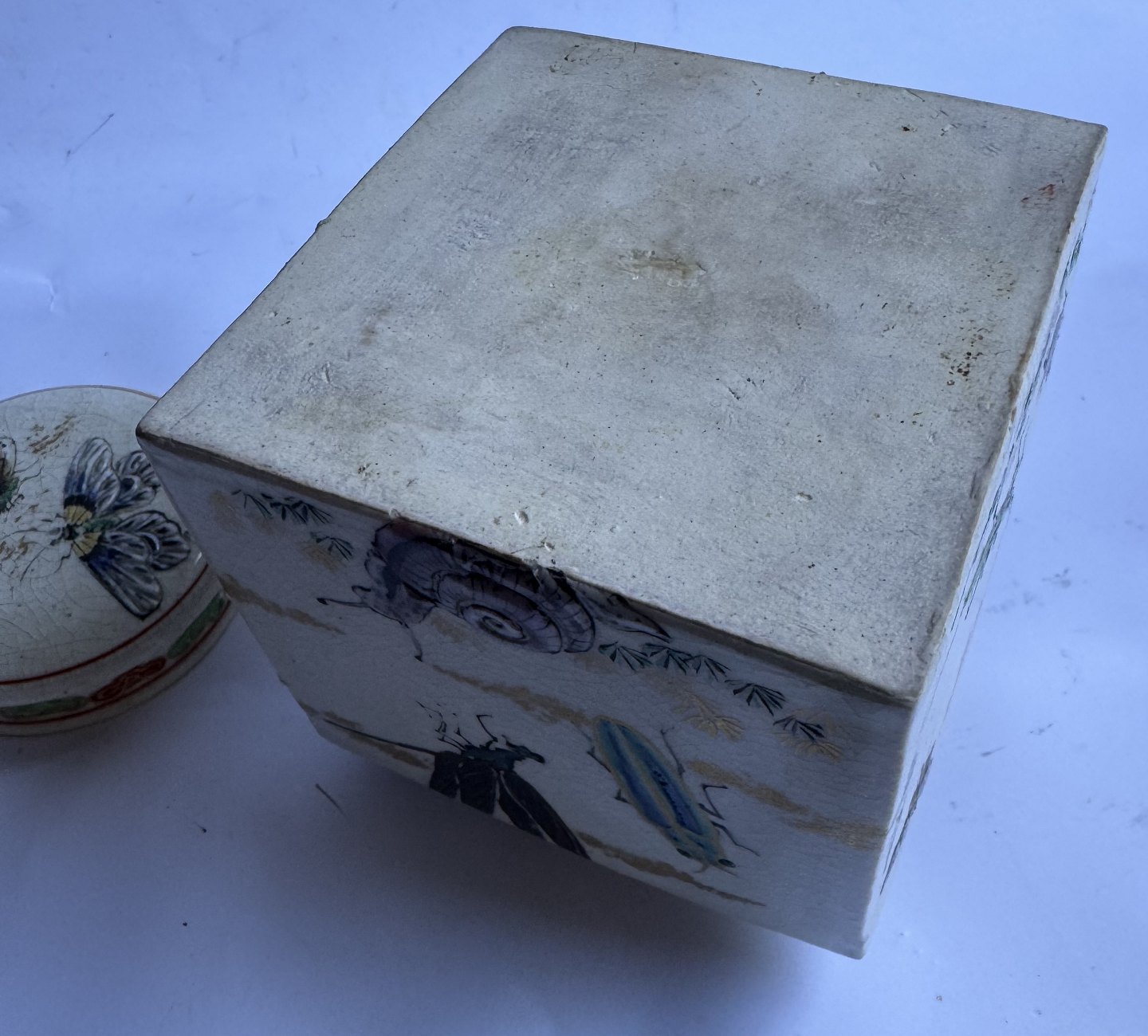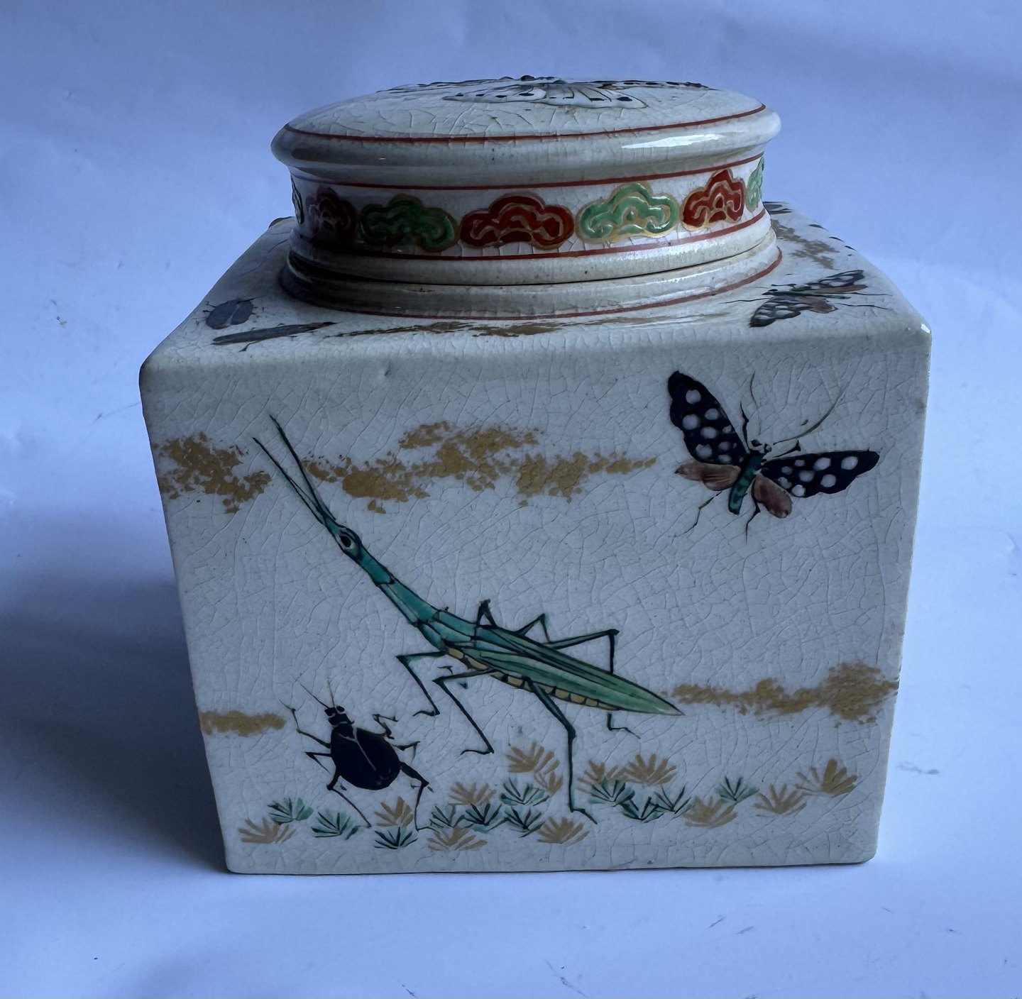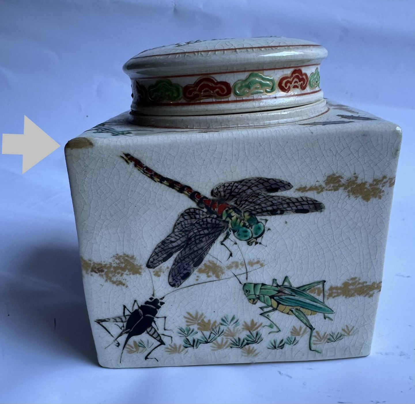 Firkantet tedåse i fajance fra Japan produceret omkring 1910. Smukt dekoreret med insekter i emalje, bl.a. sommerfugle og guldsmed, på alle sider samt på låget. Ubekendt fabriksmærke indstemplet på bunden. Ud over et lille skrab på et hjørne (følg de grå pile) er der intet at bemærke. Mål: H. 10,7 cm samt 9,5 x 9,5 cm.