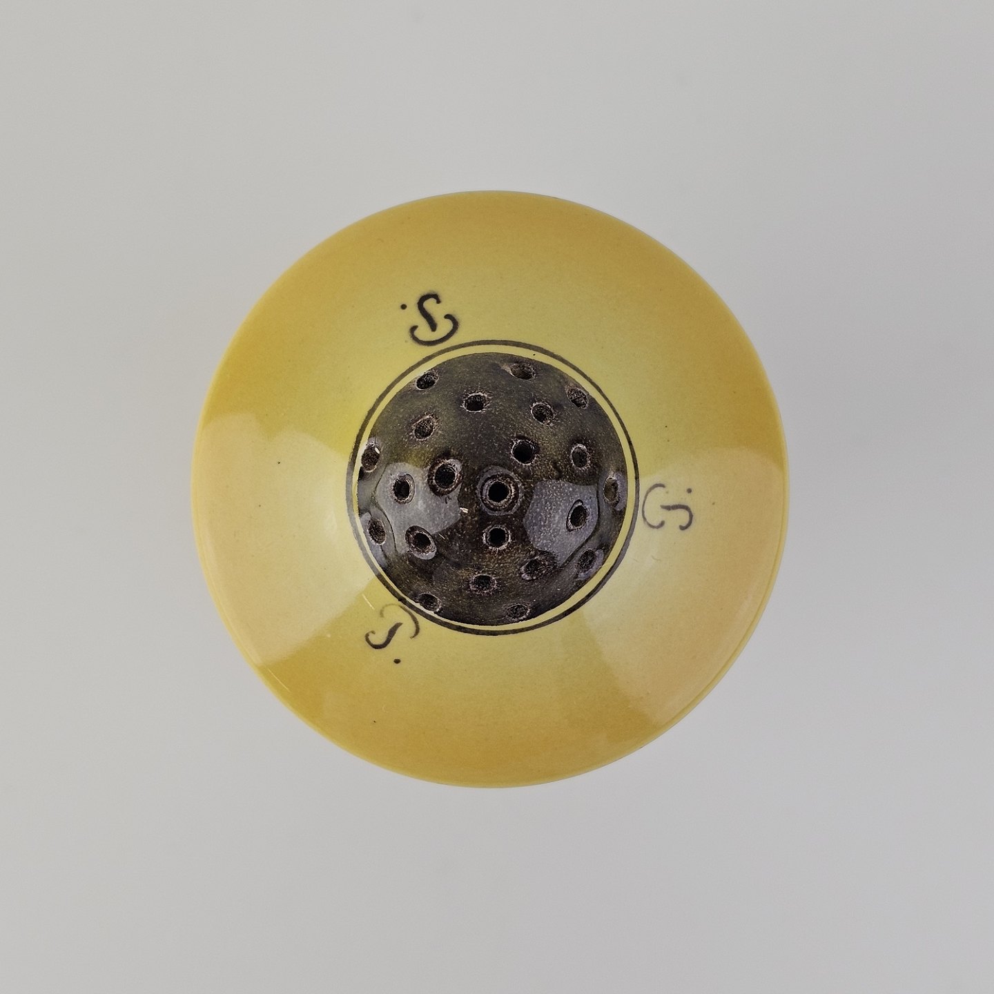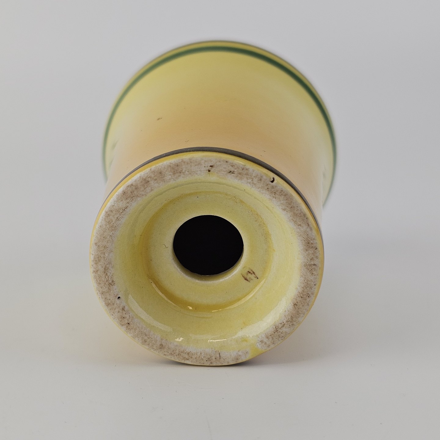 Fajancestel i stelform C med dekoration i gule nuancer med grøn stribe.