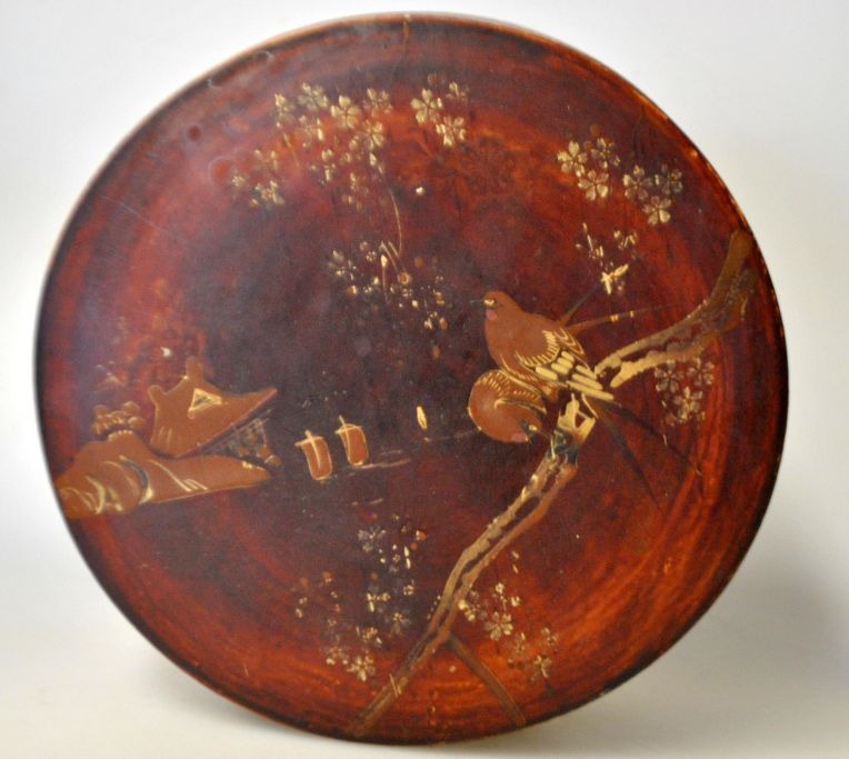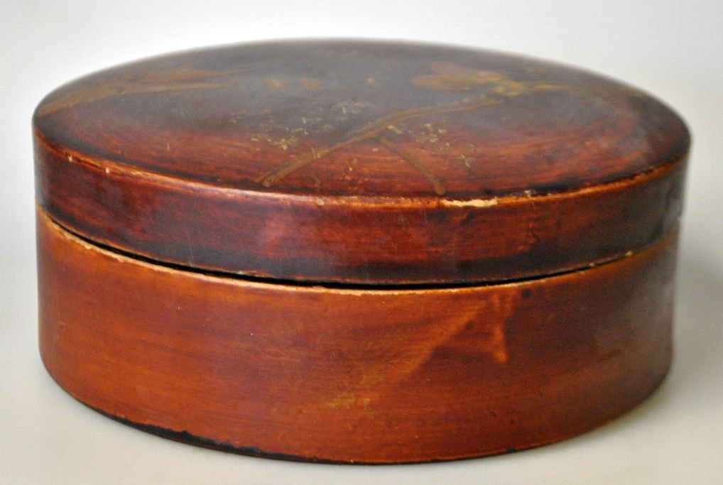 Kinesisk trææske med guldbemaling, 19. årh. Dekoreret med fugle og landskab. H: 7 cm. Dia: 17 cm.