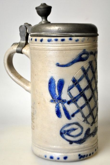 Tysk westenwälder krus, 1853, stentøj, med grå saltglasur. Med manganviolet dekorationer. Med låg og gæk i tin. Indgraveret: F.W.H. 1853. H: 23 cm.