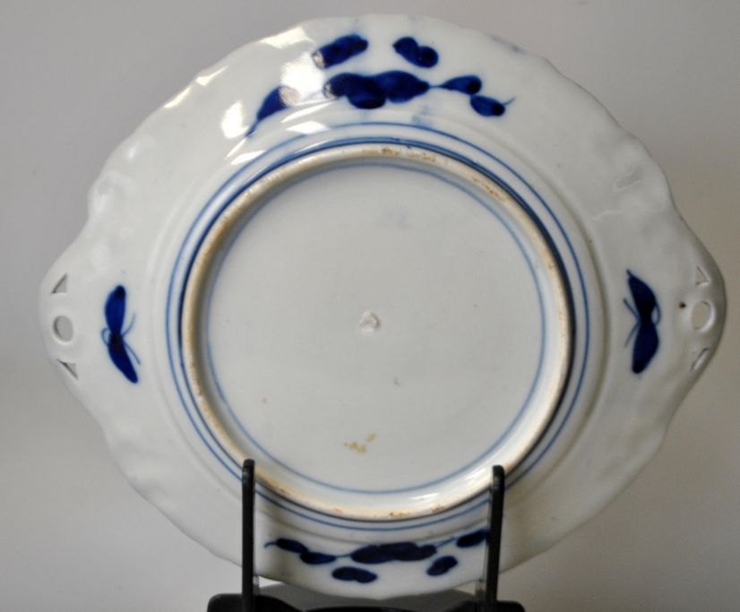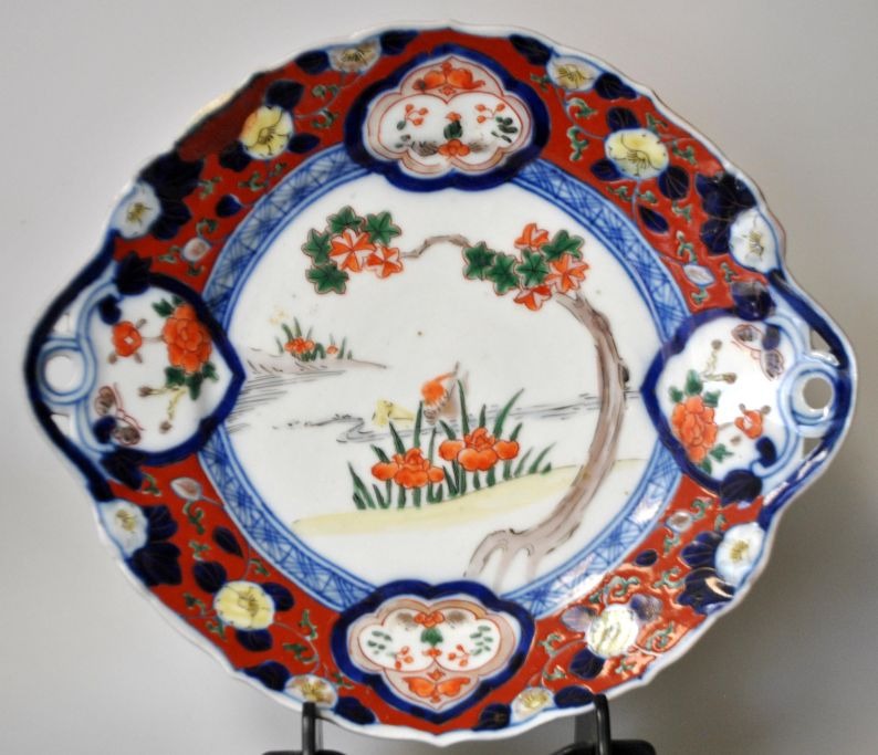 Imari fad i porcelæn, 19. årh. Japan. Med bølget rand. Polykrom dekoration med blomster. Delvis i transfer teknik. Dia.: 24 cm.