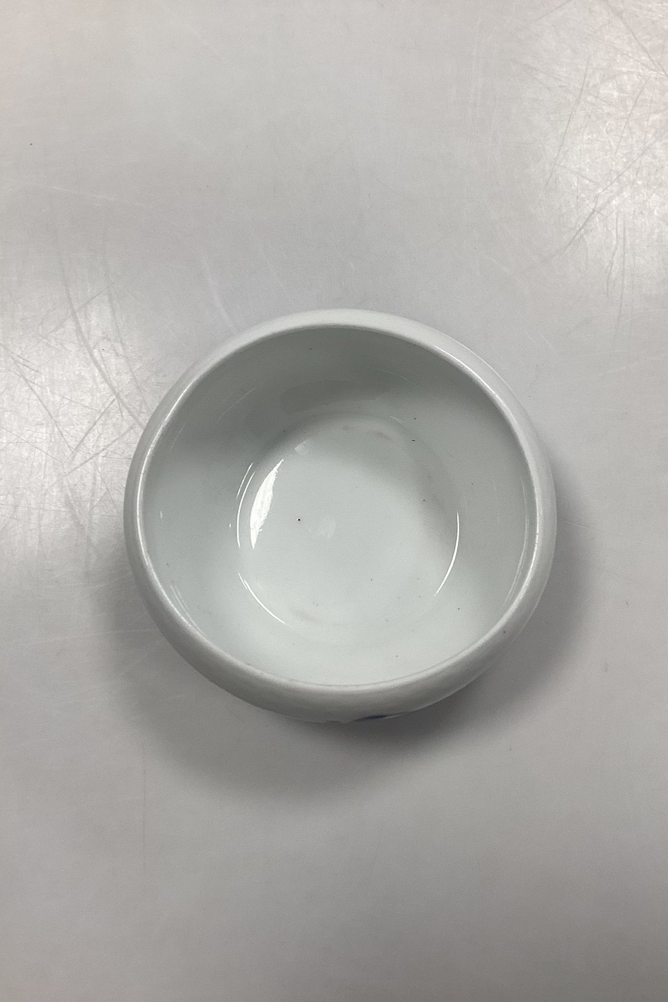 Royal Copenhagen Blå Blomst Flettet Skylleskål No. 8224. Måler 13 cm x 13,5 cm / 5,12 in. x 5,31 in. pga skævhed i kanten. 2. Sortering med små sorte brændingsnister og lille glasurfejl indvendig øverst under kanten, se foto.