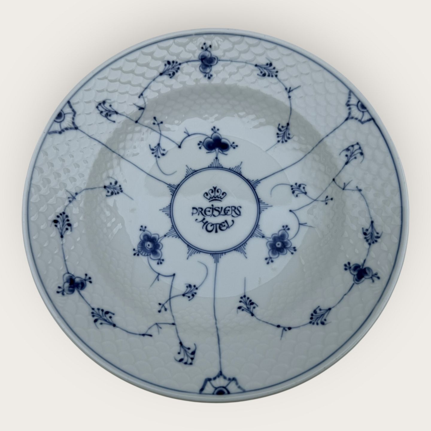 Bing & Grøndahl, Blå malet (Musselmalet), #1008, stor dyb tallerken i hotelporcelæn ( Jernporcelæn ) med logo fra Preislers Hotel, 25cm i diameter, 1. sortering * Pæn stand*