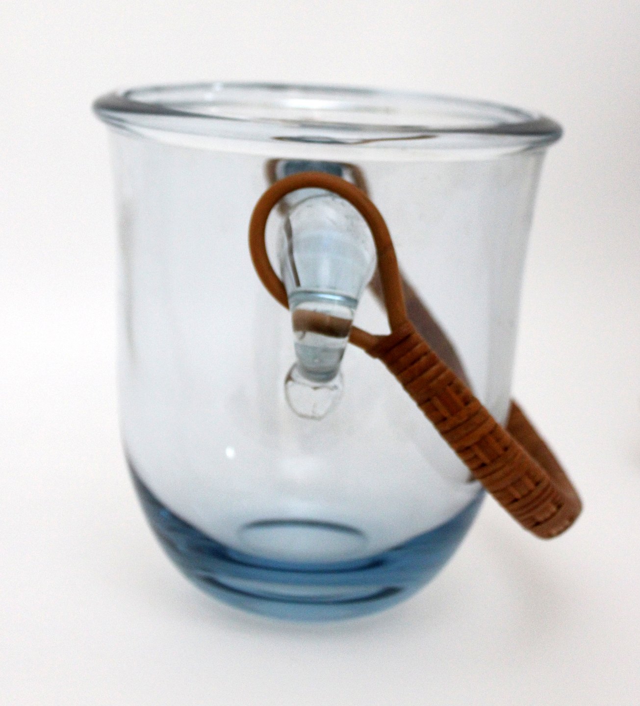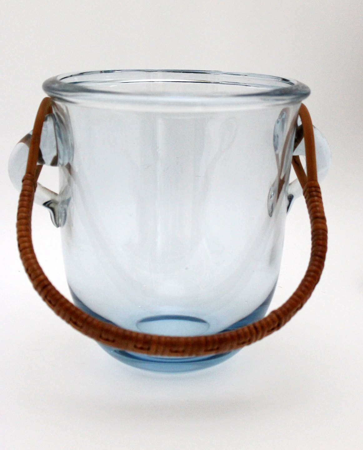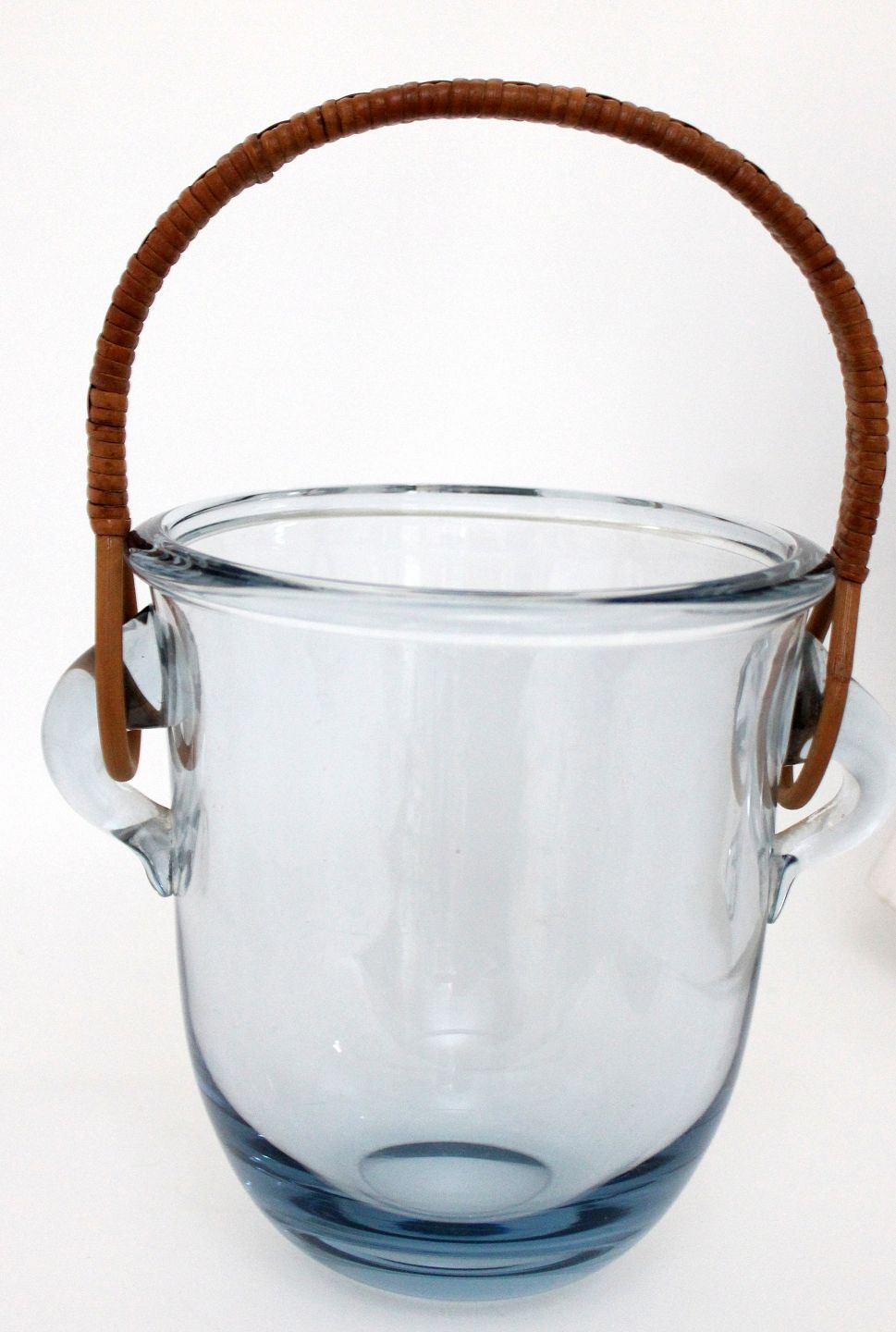 Holmegaard, Champagnekøler, stor isspand i transparent aquablå kraftigt glas med basthank. Designet af Jacob E. Bang i 1934. Ingen signatur. Højde 19,5 cm. Øverste diameter 18 cm. Vægt 2 kg. God stand men fremstår med ridser midt på. Pris: 675 kr. stk. Lager: 1