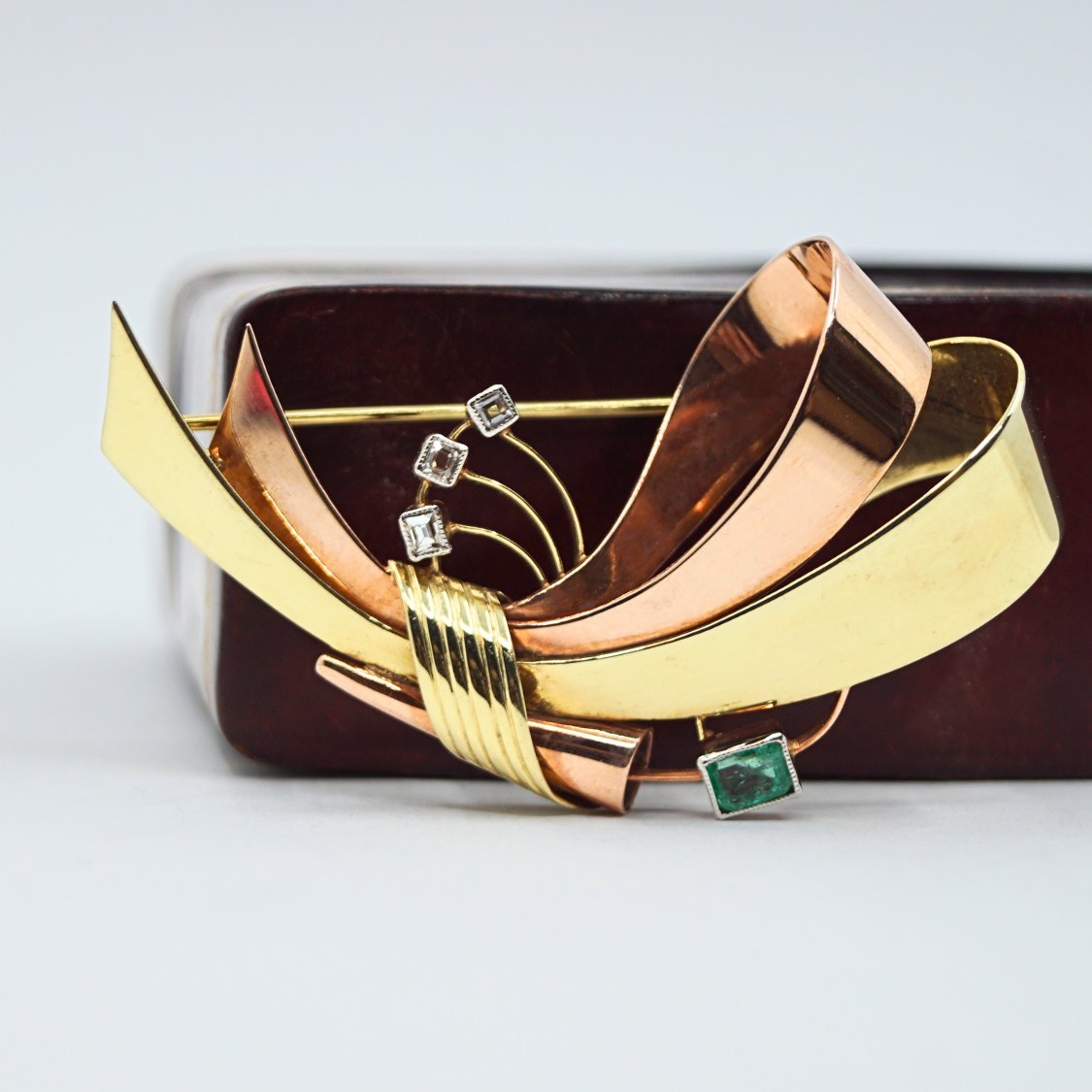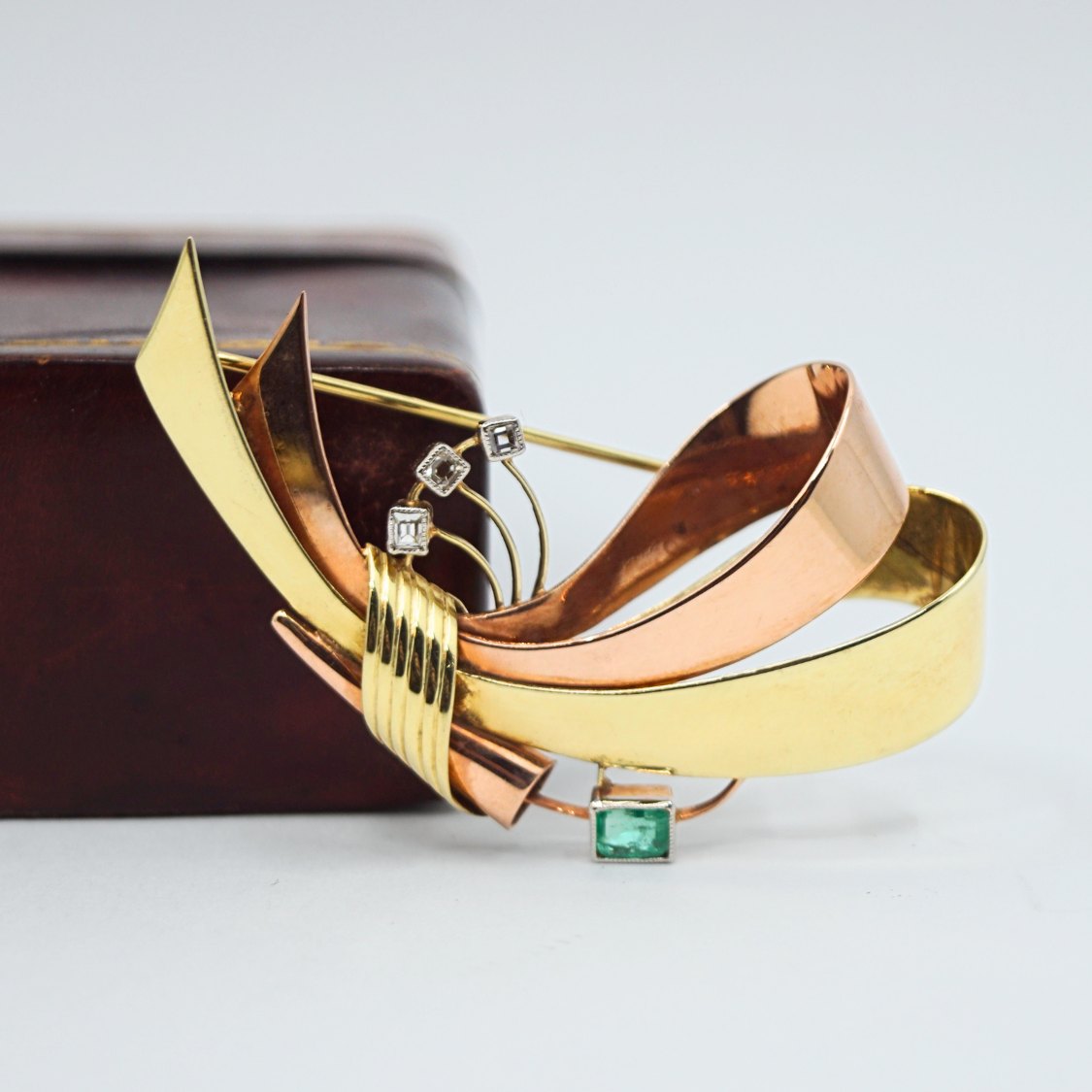 Viggo Wollny; Brooch in 14k gold and rose gold with diamonds and emerald set in white gold. From 1930 - 1940.