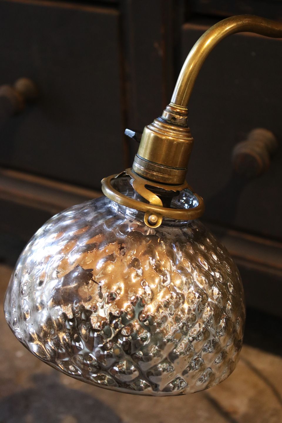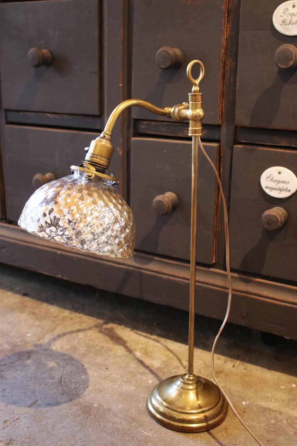 Gammel fransk Bureau bordlampe i messing med original lampeskærm i vaflet fattigmandssølv...