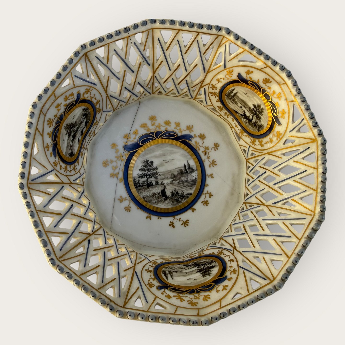 Nymphenburg porcelæn, to retikulerede skåle (gennembrudt gittermønster i kanten), med håndmalede landskabsmotiver, den ene skål med revne i bunden ( se foto) ellers fin stand, Hver skål måler ca. 5x14cm.