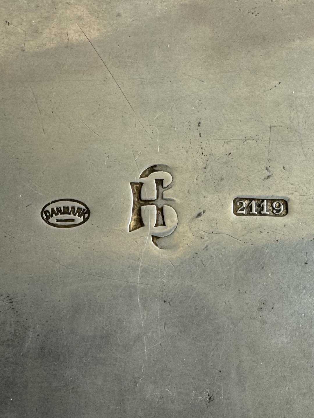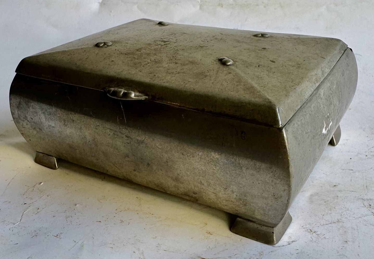 Art deco perioden: Skrin i tin. Fremstillet hos Mogens Ballin’s efterfølger Hans Peter Hertz (HPH) i 1921. Lidt brugsspor på låget. Ved hængslet (se fotos). Ellers i god stand uden skader eller reparationer. Aldersrelateret brugsspor indvendigt. Fabriksmærket på bunden med HPH. 2119. Mål: H. 5,5 cm Ø. Kassen måler 9 x 11,7 cm.