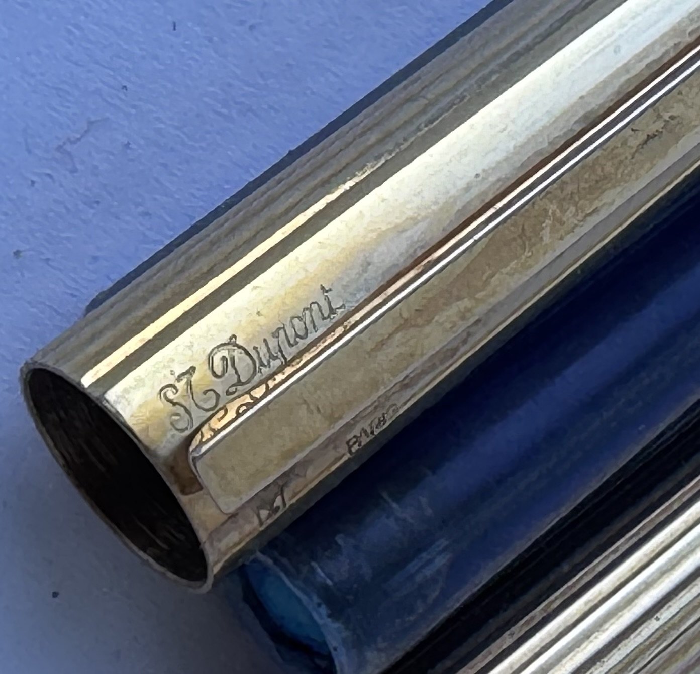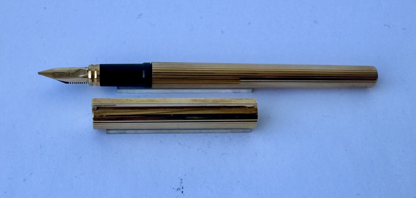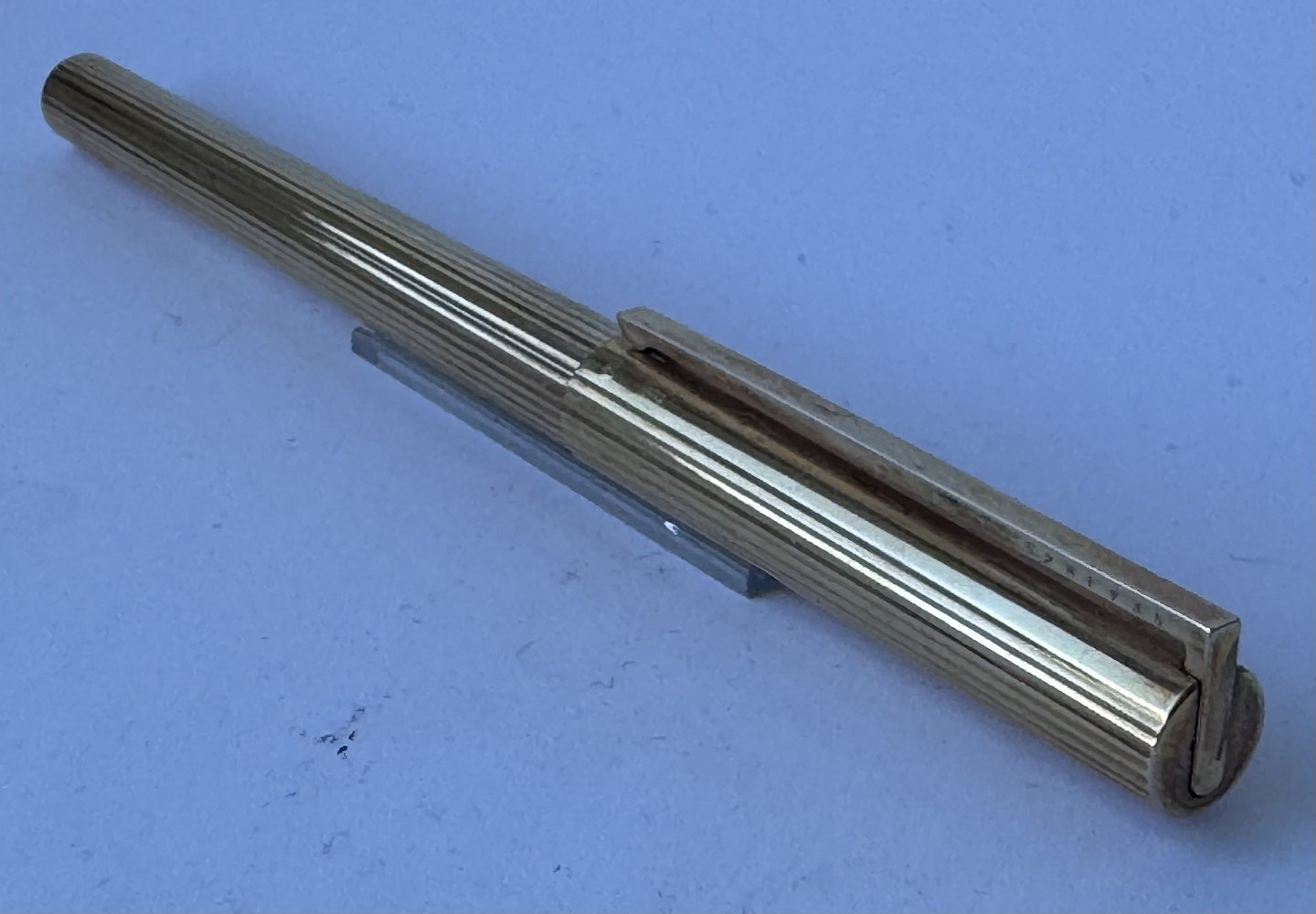 Slank S.T. Dupont De Paris 925 Sterling guld-double fyldepen fremstillet i 1970’erne. Alle dele originale inklusiv en 18 karat guldspids. Fremstår i god og skriveklar stand, når der bliver indsat en ny blæk-patron. Ingen skader eller reparationer .L. 13,9 cm