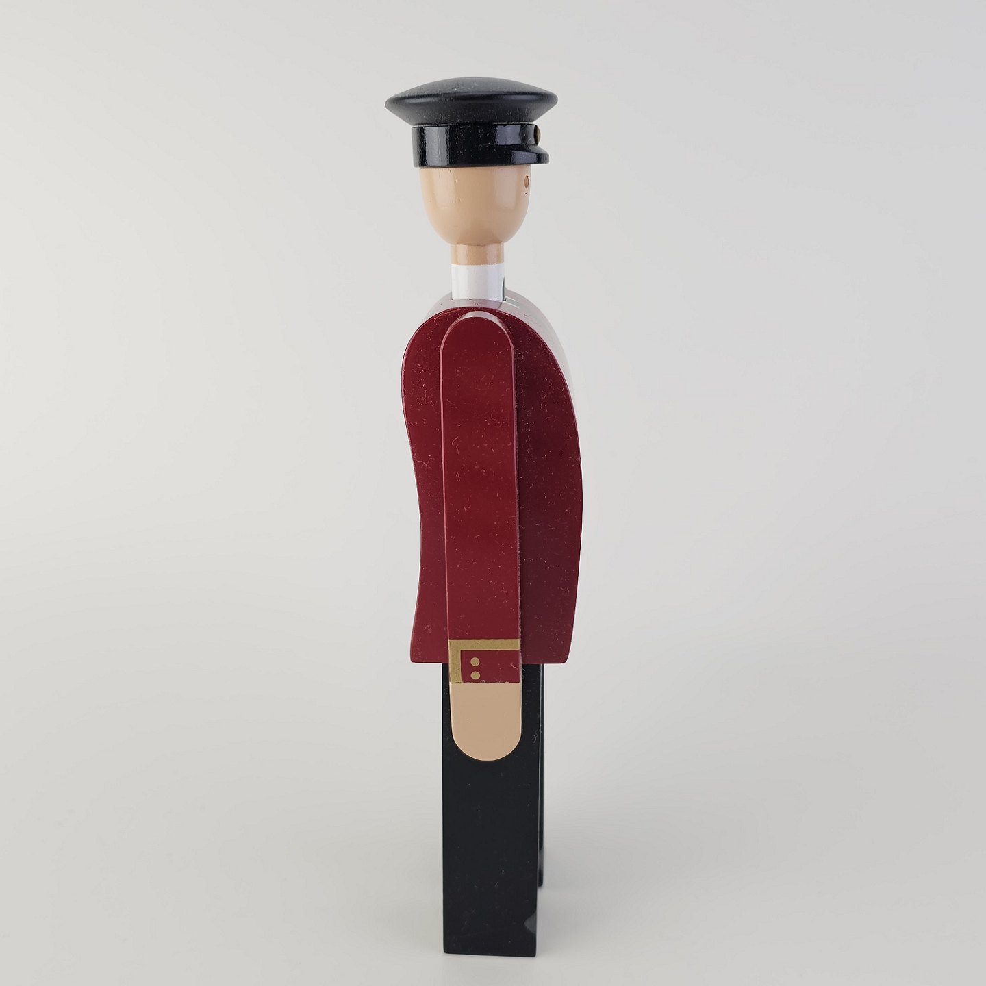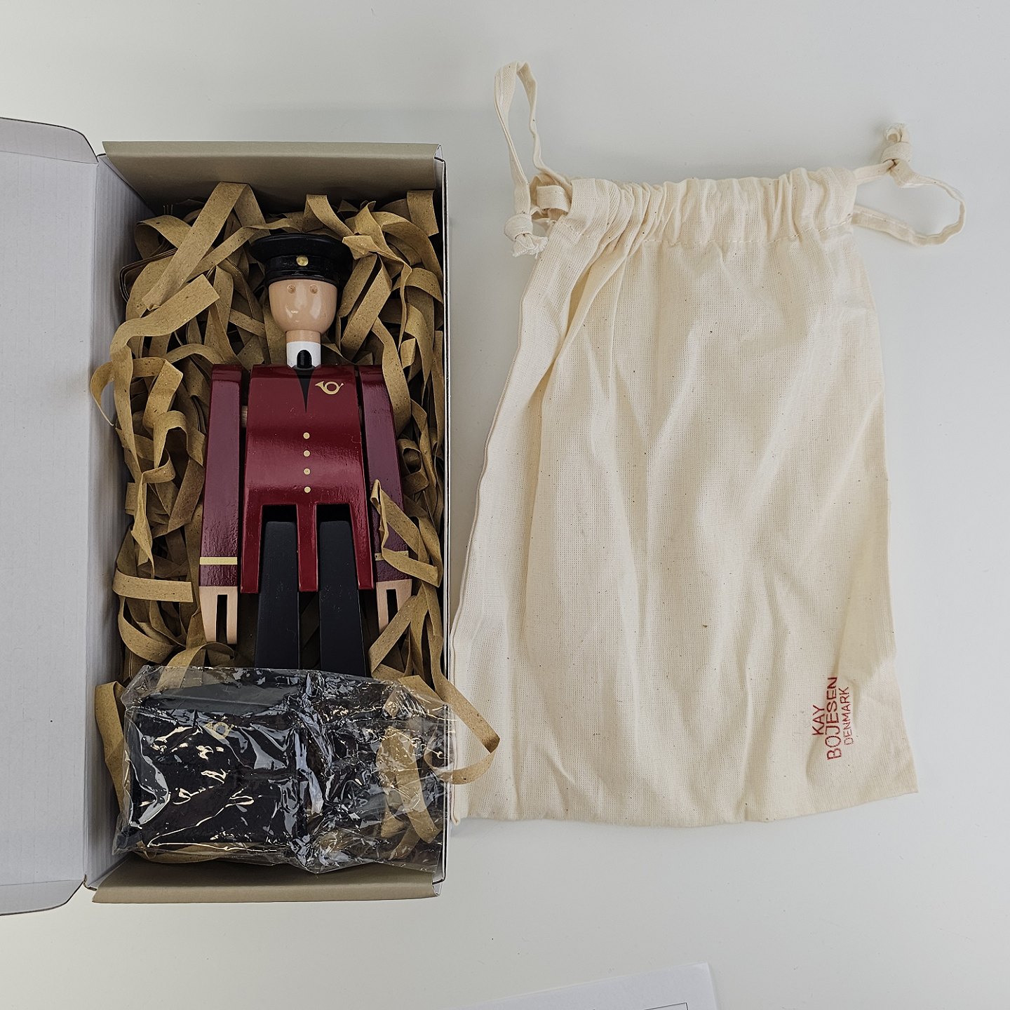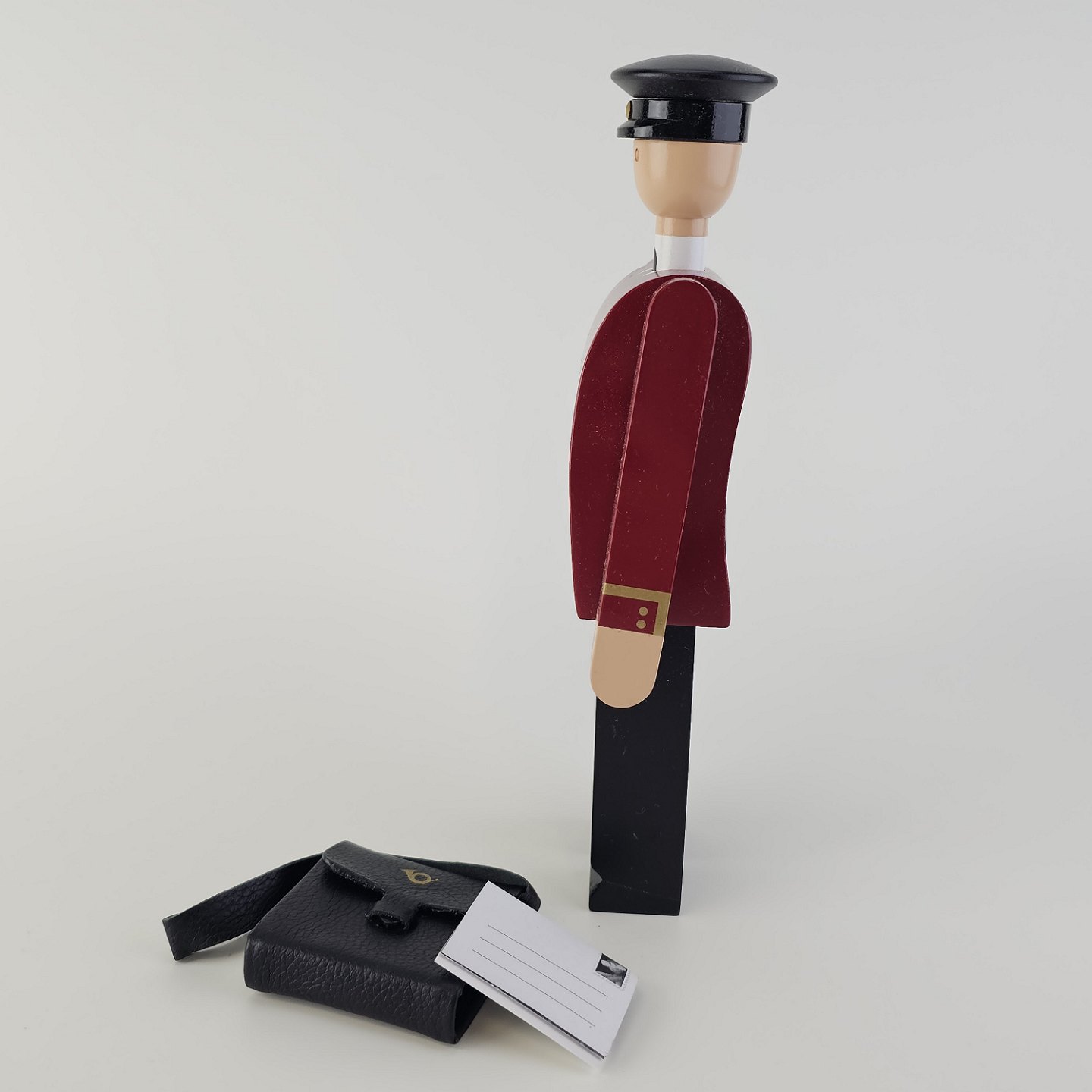 Figur i malet bøgetræ med motiv af et postbud med lædertaske, kommer i original kasse