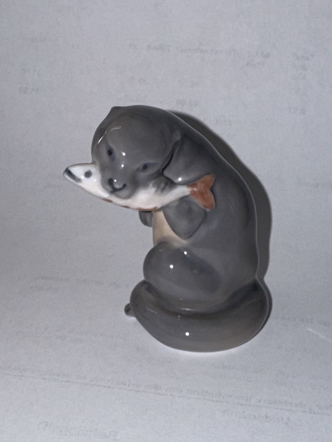 Figur i porcelæn af odder med fiskefangst i munden fra Royal Copenhagen. 2. Sortering. I god stand uden skader eller reparationer. Fabriksmærket samt Modelnummer 2333 på bunden. H. 5 cm