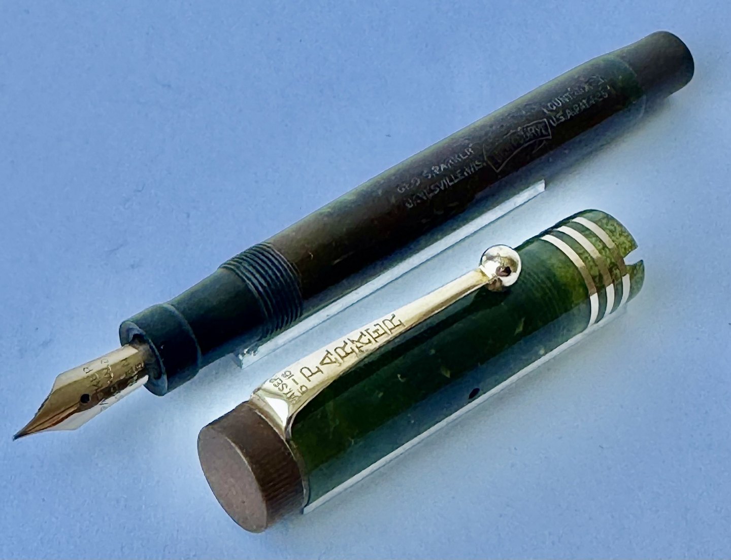 Kort grøn marmoreret Lady Parker Duofold Lucky Curve fyldepen fra omkring 1930. Har et stort skår på hættens åbning, kant. Ellers ingen skader eller reparationer. Push button blæk-påfylder. Der skal indsættes en ny gummisæk før end fyldepennen igen kan optage blæk og skrive. 11,5 cm lang.