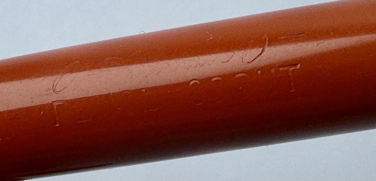 Mindre koralrød Penol-Scout Ambassador fyldepen. Push button filler. Der skal indsættes en ny gummisæk før den igen kan optage blæk og skrive igen. Ny gummisæk kan indsættes for et tillæg på kr. 250,- Alle dele originale til denne model. Ingen skader eller reparationer. Lette almindelige brugsspor på overfladen. Længde 11,7 cm
