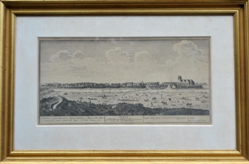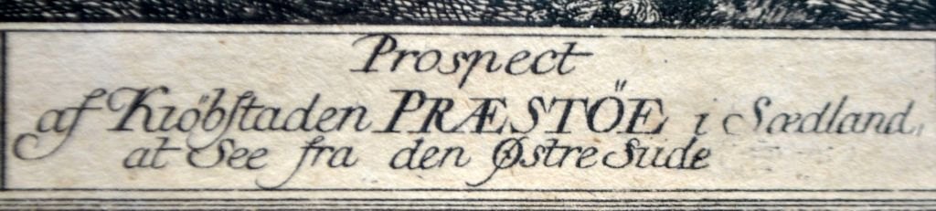 Bruun, Johan Jacob (1715 - 1789) Danmark: Prospect af Kjøbstaden Præstöe. Kobberstik. Signeret. H: 17,5 cm. B: 35 cm. Indrammet: H: 33 cm. B: 50 cm.