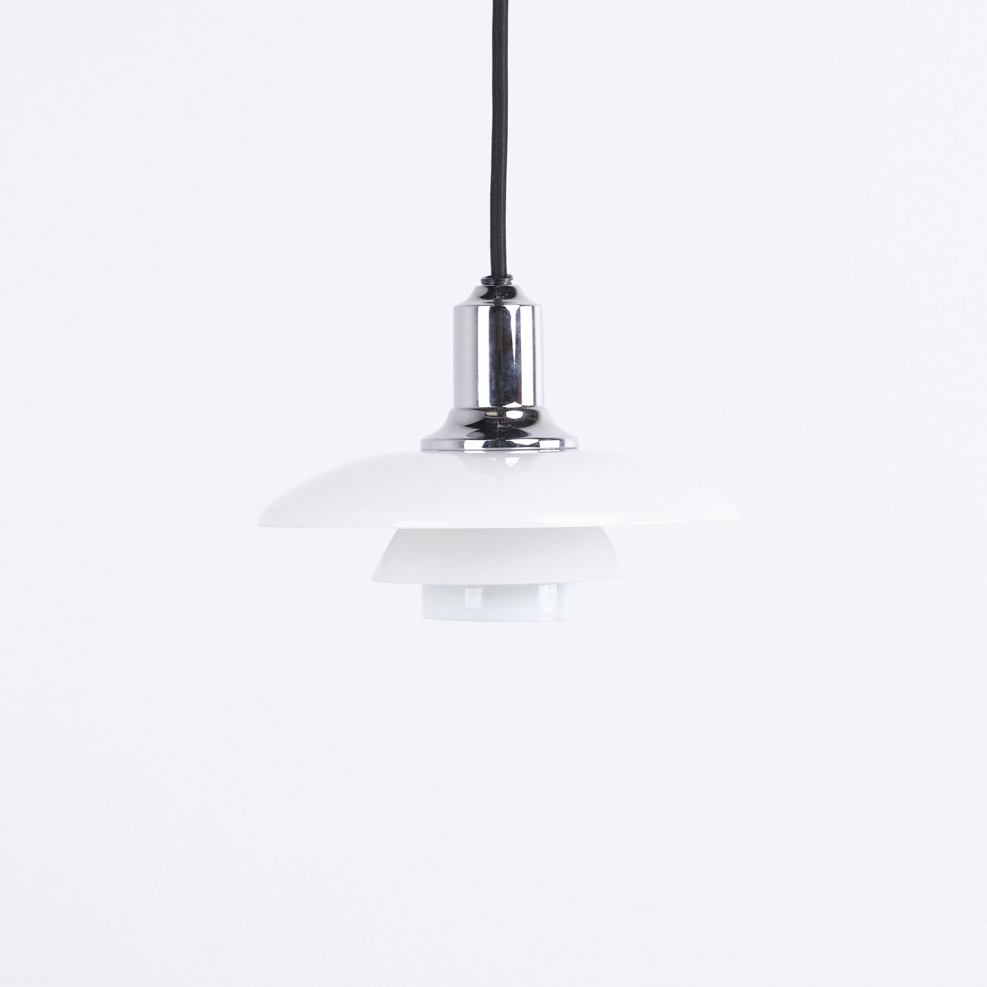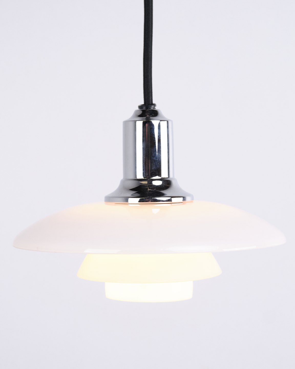 PH 2/1 pendel i krom med opalglas fra Louis Poulsen. Designet af Poul Henningsen med klassisk dansk lysdesign og blændfri belysning.