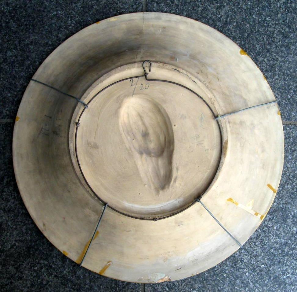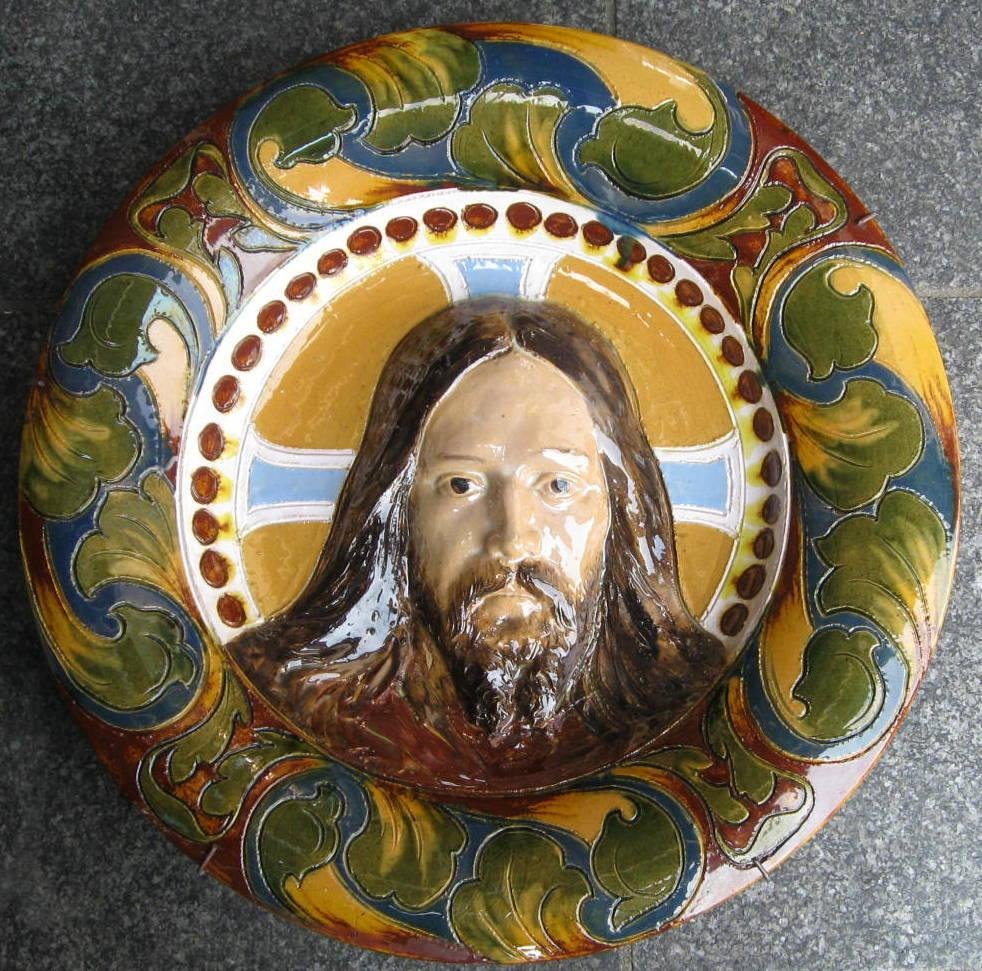 Dansk keramiker (19. årh.) Danmark: Kristus. Rødler med glasur. I farverne grøn, brun, blå, hvid og lyseblå. Ikke signeret. Dia.: 40 cm. På bagsiden forskellige blyantsantegninger, hvor der angives priser i dollars. Værket har antagelig været udstillet i USA. Med reparationer.