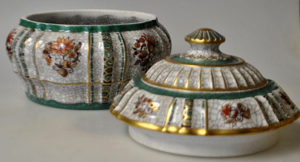 Dahl Jensen lågkrukke i craquelle, 241/704, 20. årh. København, Danmark. Håndmalede blomstermotiver, grønt og forgyldninger. H: 16 cm. Dia: 19 cm.