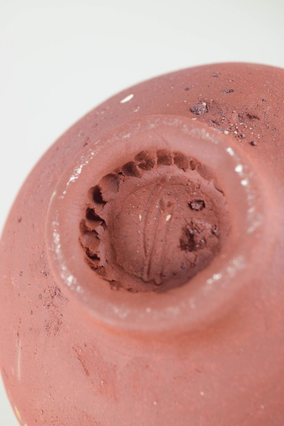 Lille unika skål i rødt stentøjsler på fod. Uglaseret på ydersiden fremstår den med det røde, varme ler som en kontrast til den cremehvide matte krystalglasur der optræder indvendigt.