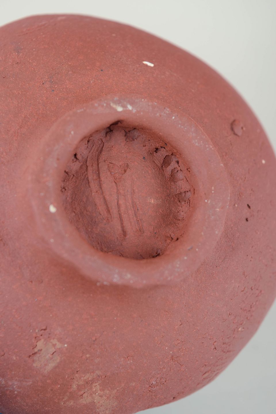 Lille bitte unika skål i rødt stentøjsler på fod. Uglaseret på ydersiden fremstår den med det røde, varme ler som en kontrast til den cremehvide krystalglasur der optræder indvendigt.