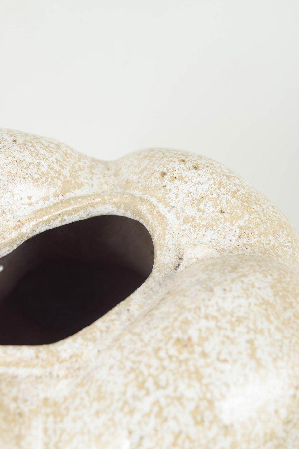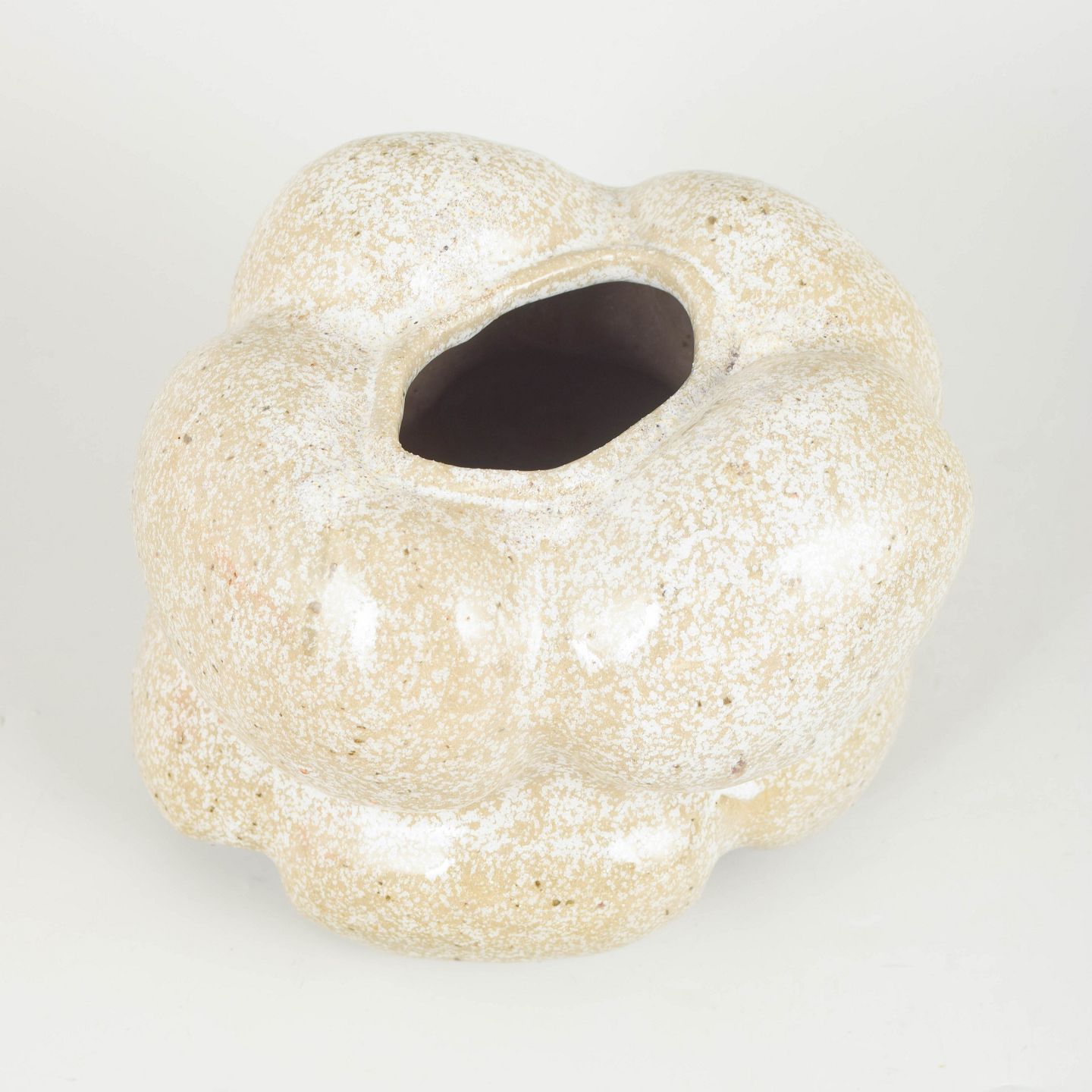 Unika stentøjsskulptur, organisk formet. Glasuren der dækker vasen er snowflake glasur, en glasur der er klar med bittesmå hvide krystaller der minder om snefnug.
