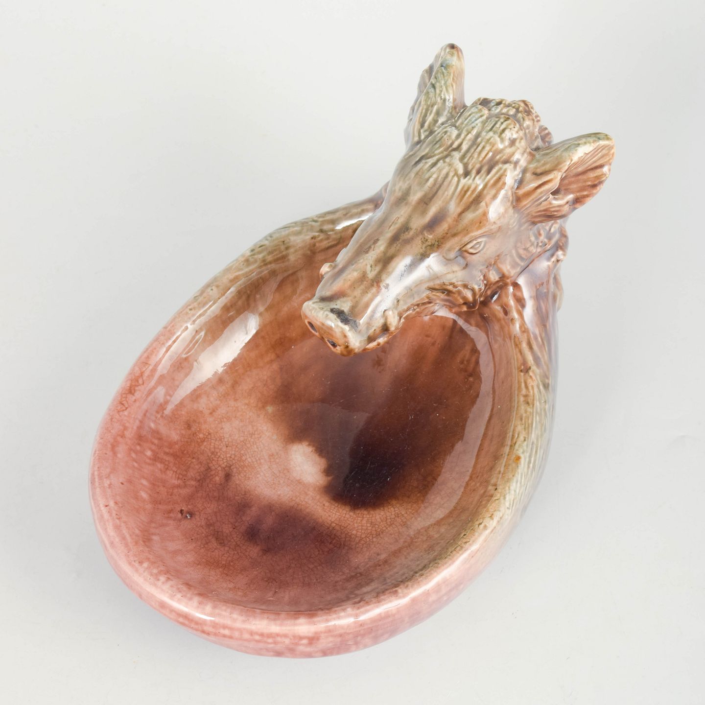 Skål i stentøj udformet som et vildsvinehoved med naturalistiske detaljer og glaseret i varme brunlige og rosa nuancer. Dekorativ og funktionel genstand med karakteristisk tidlig 1900-tals formsprog.