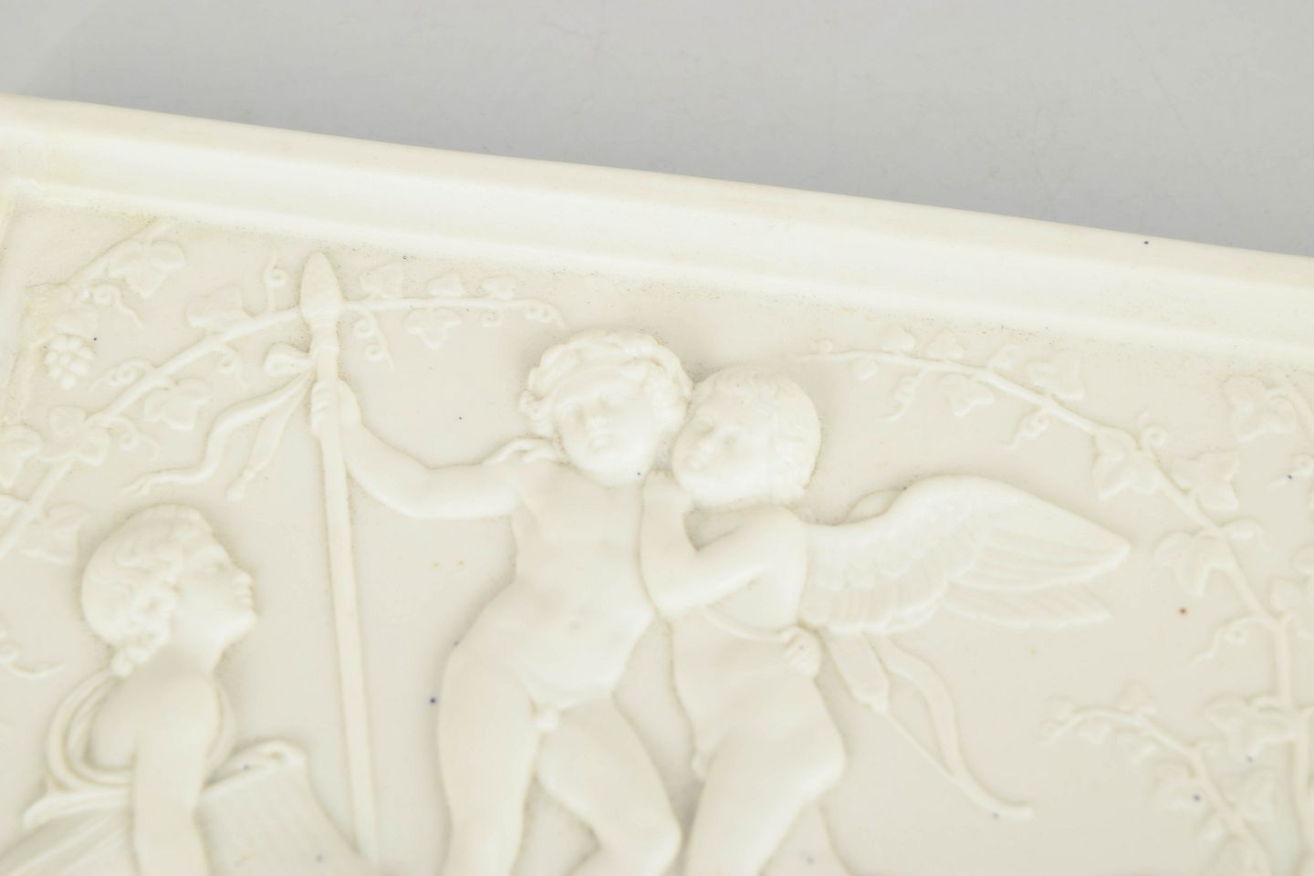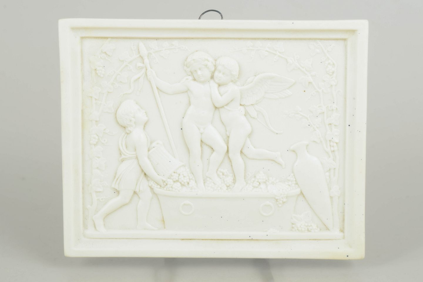Rektangulært vægrelief i hvidt bisquitporcelæn med klassicistisk motiv af putti og figurkomposition efter Bertel Thorvaldsen, udført med fine detaljer og blød modellering i nyklassicistisk stil.