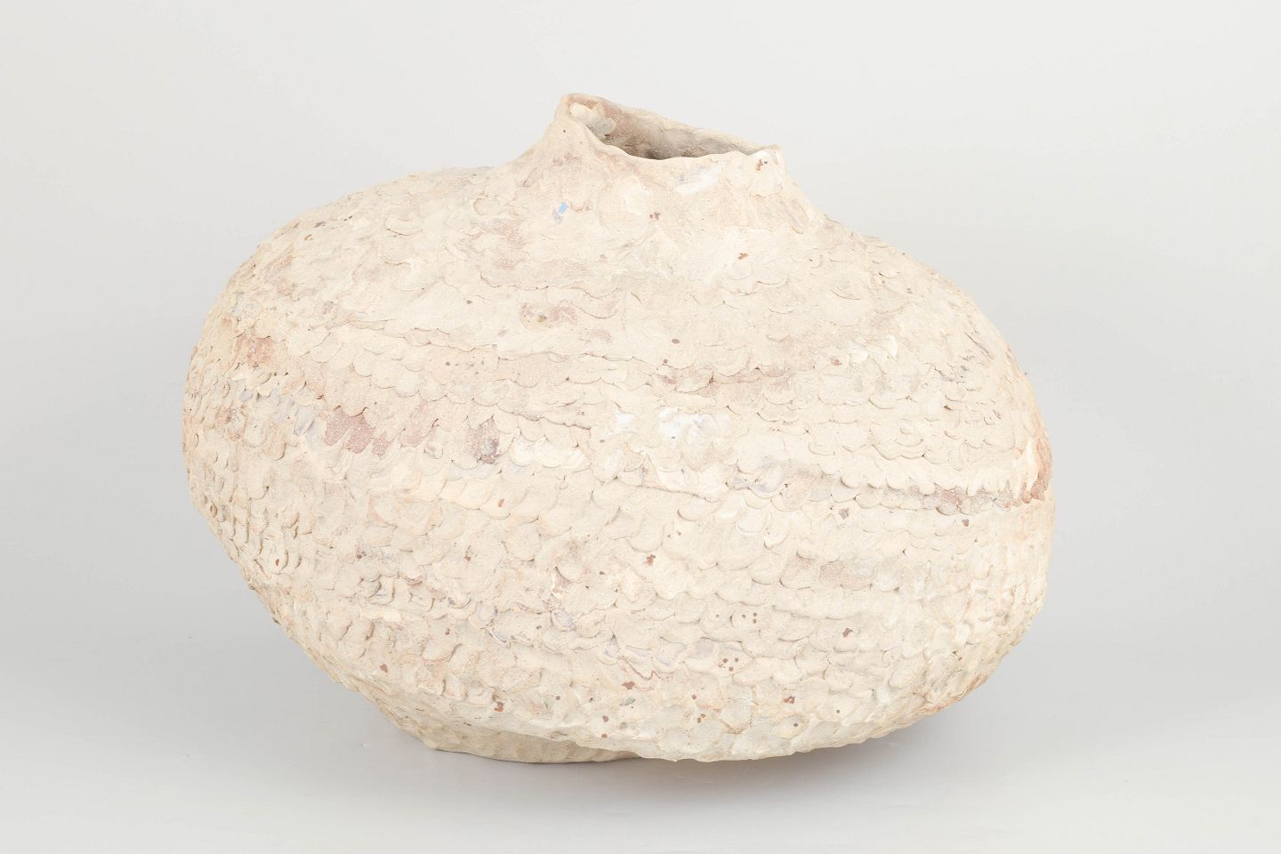 Stor unika rund stentøjsvase. Værket er uglaseret i kunstnerens signaturstil med blandede lertyper. Leret er genbrugsler, der er sammensat med tusindvis af kunstnerens tryk med fingrene, dette giver værket et taktilt, organisk og blødt udtryk. Kan ikke holde væske.