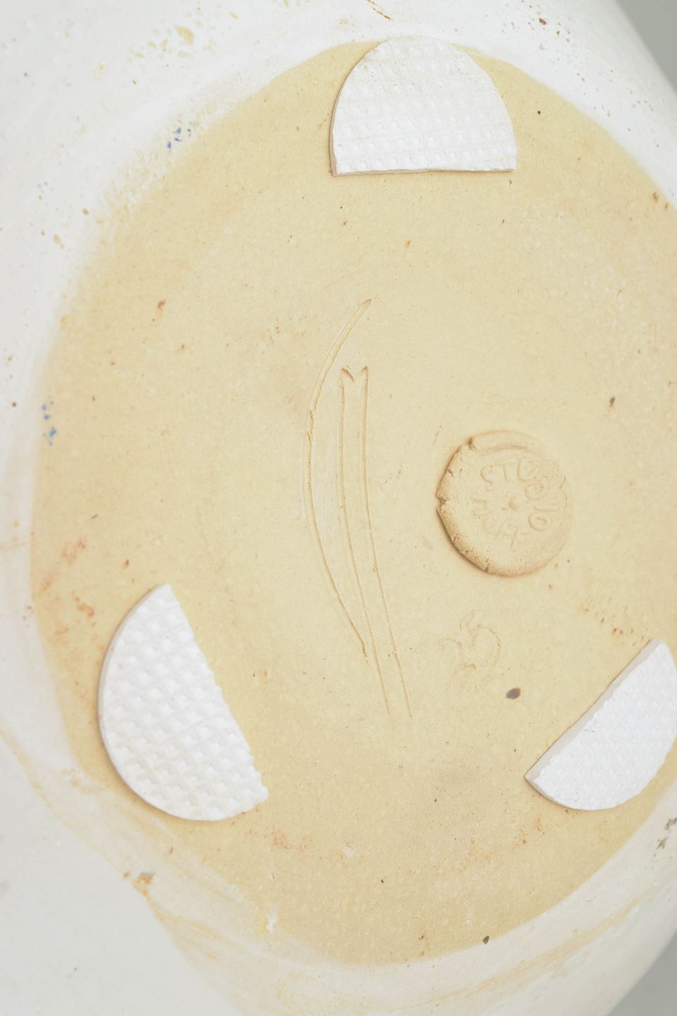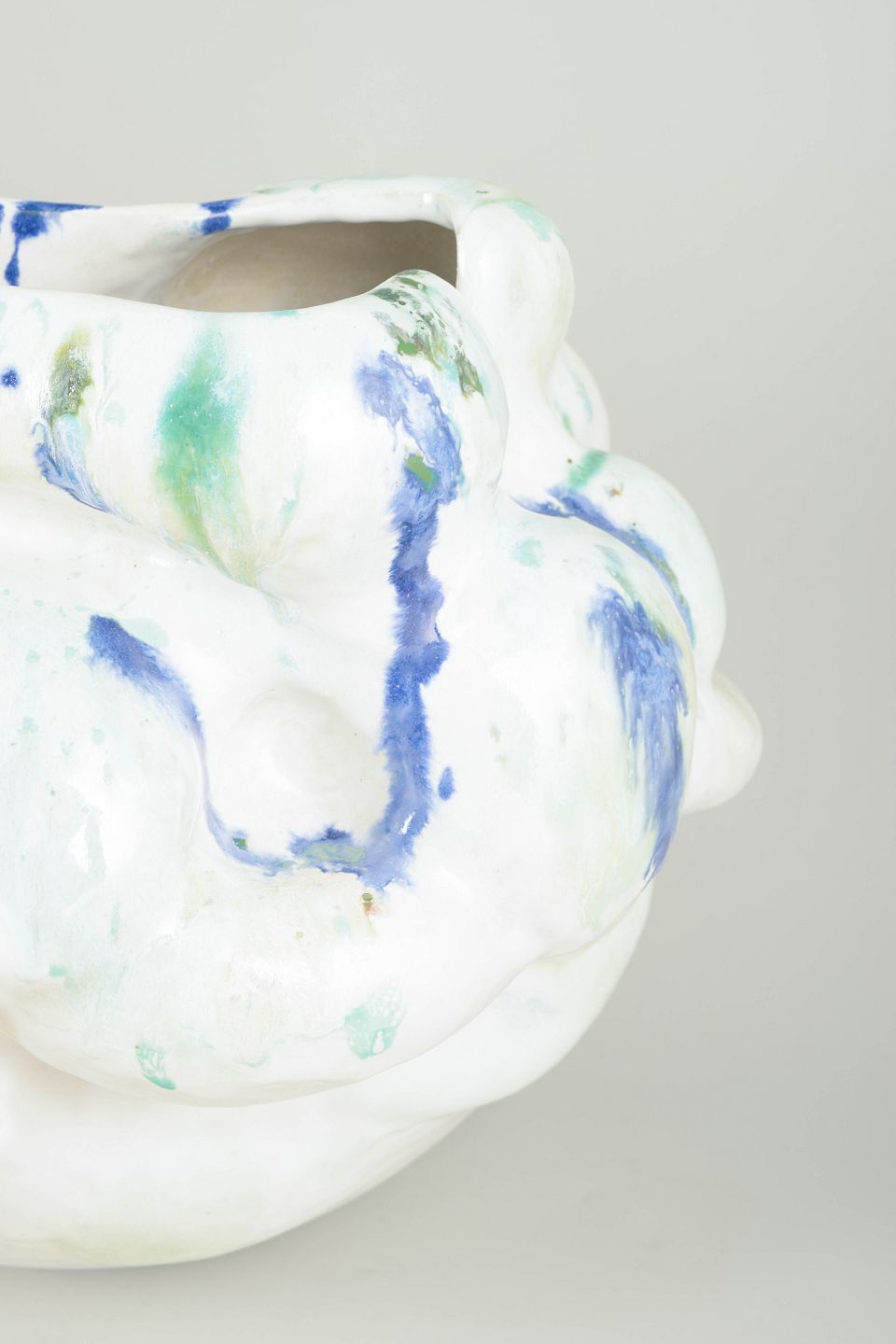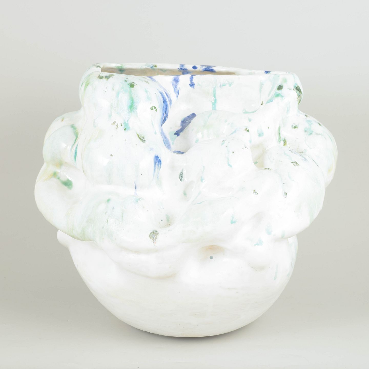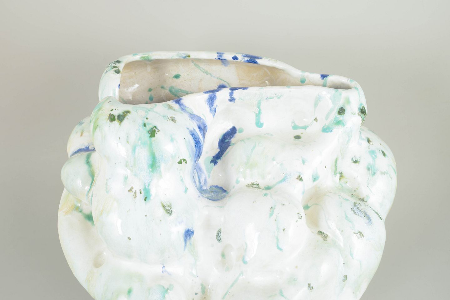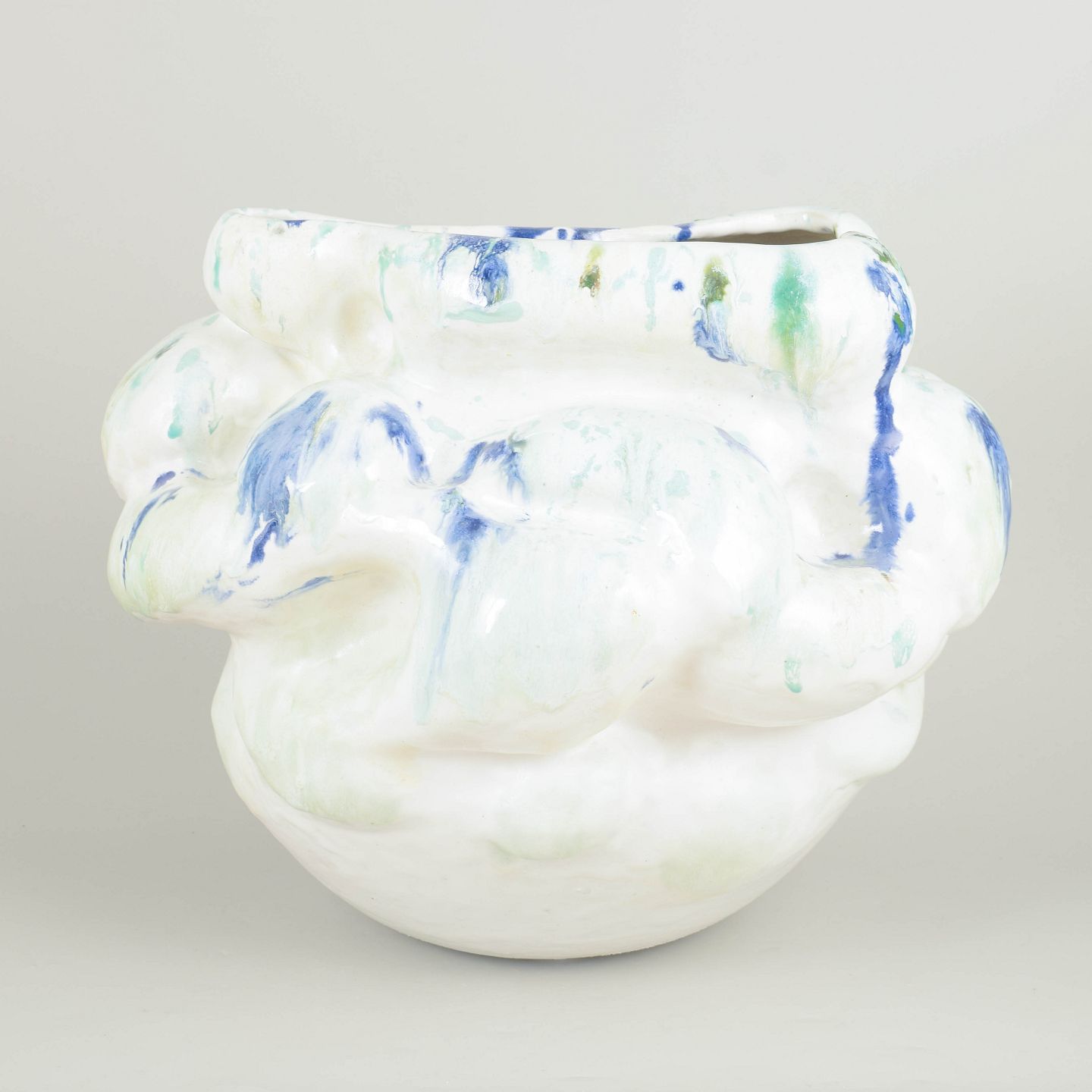 Stor rund unika stentøjsvase, organisk formet med aflang åbning. Glasuren er en hvid blank med strejf af grønne, turkise og blå toner.