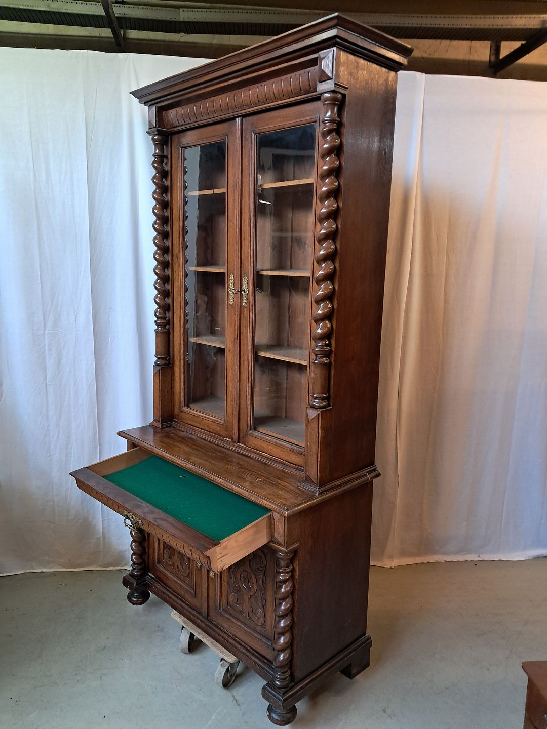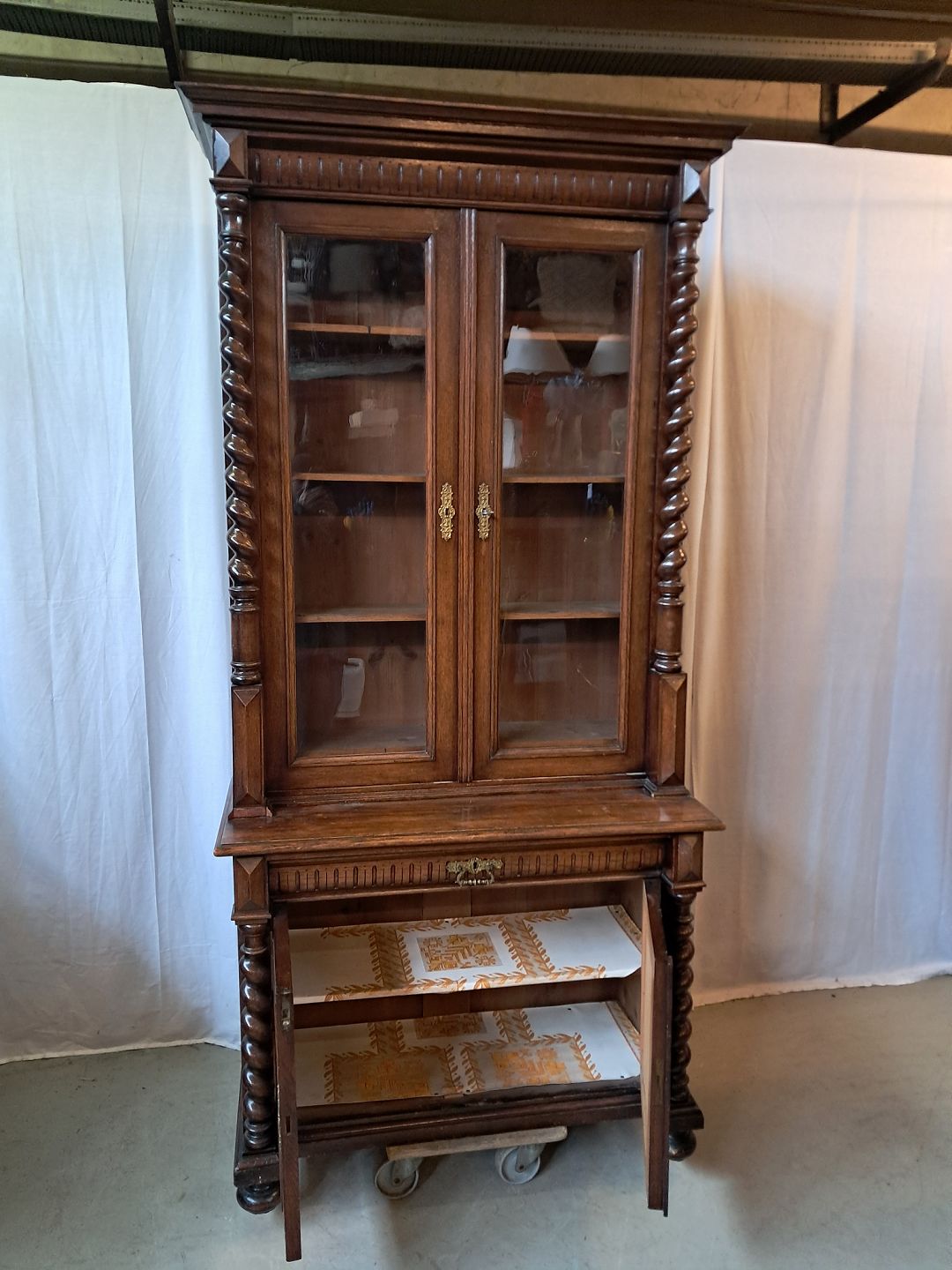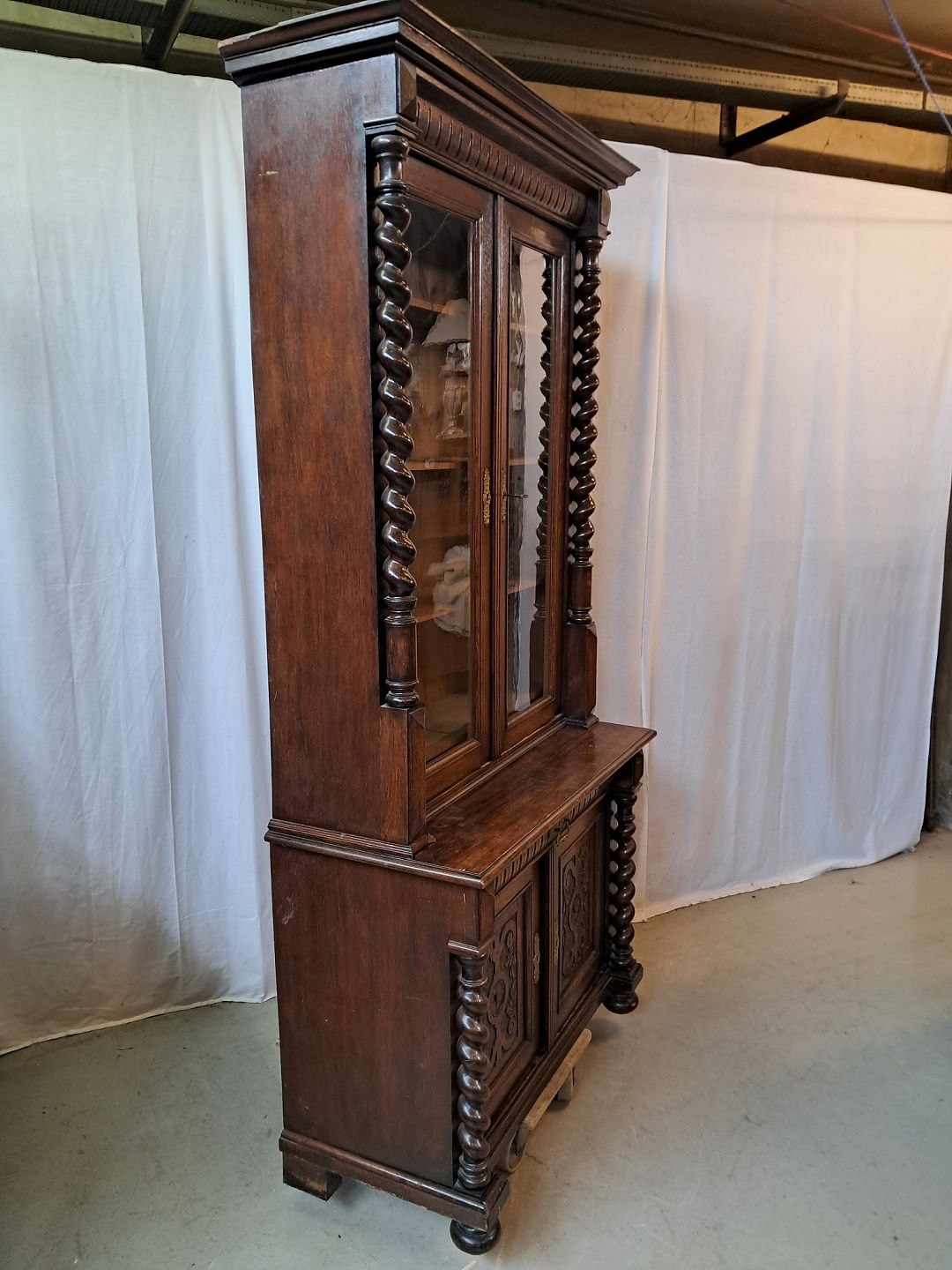 Skab med vitrineoverdel i massivt og fineret egetræ, fra 1900erne.