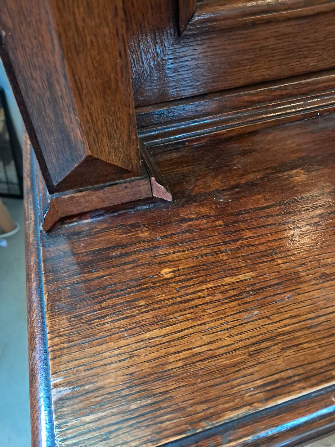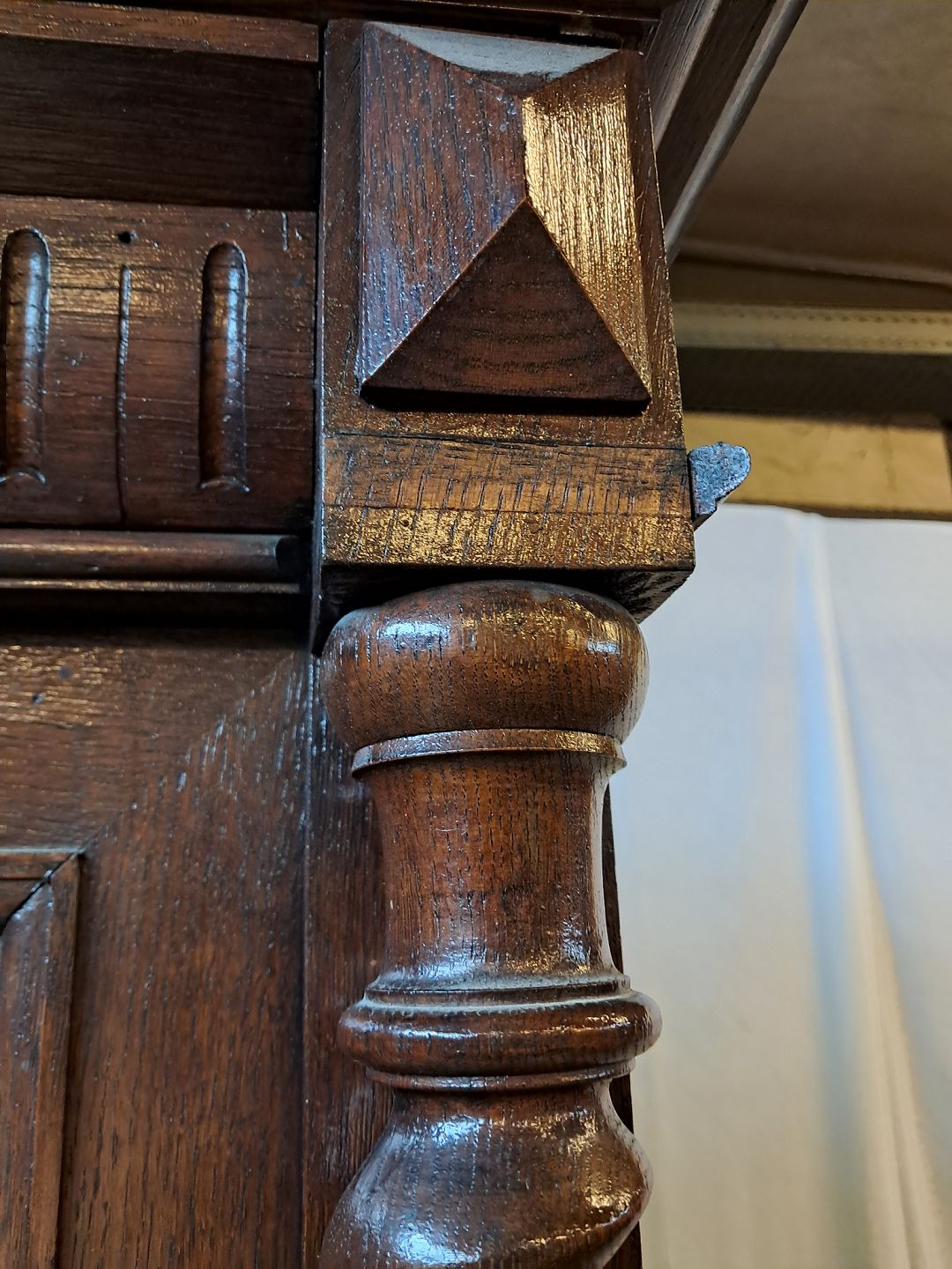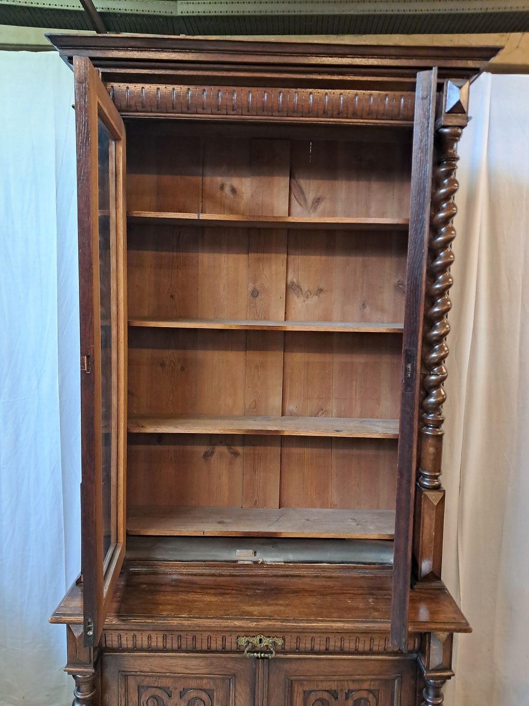 Skab med vitrineoverdel i massivt og fineret egetræ, fra 1900erne.