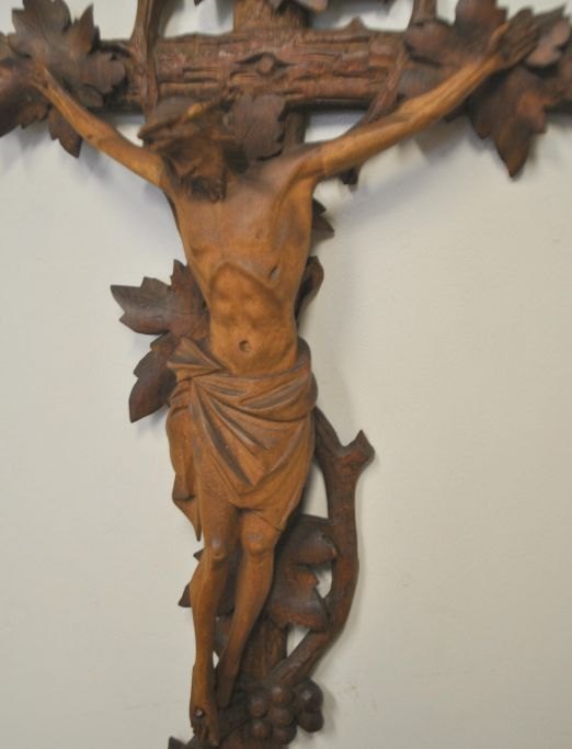 Udskåret træ krusifix, 19. årh. Tyskland. Kors dekoreret med vinranke, vindruer og løb. H: 48 cm. B.: 22 cm.