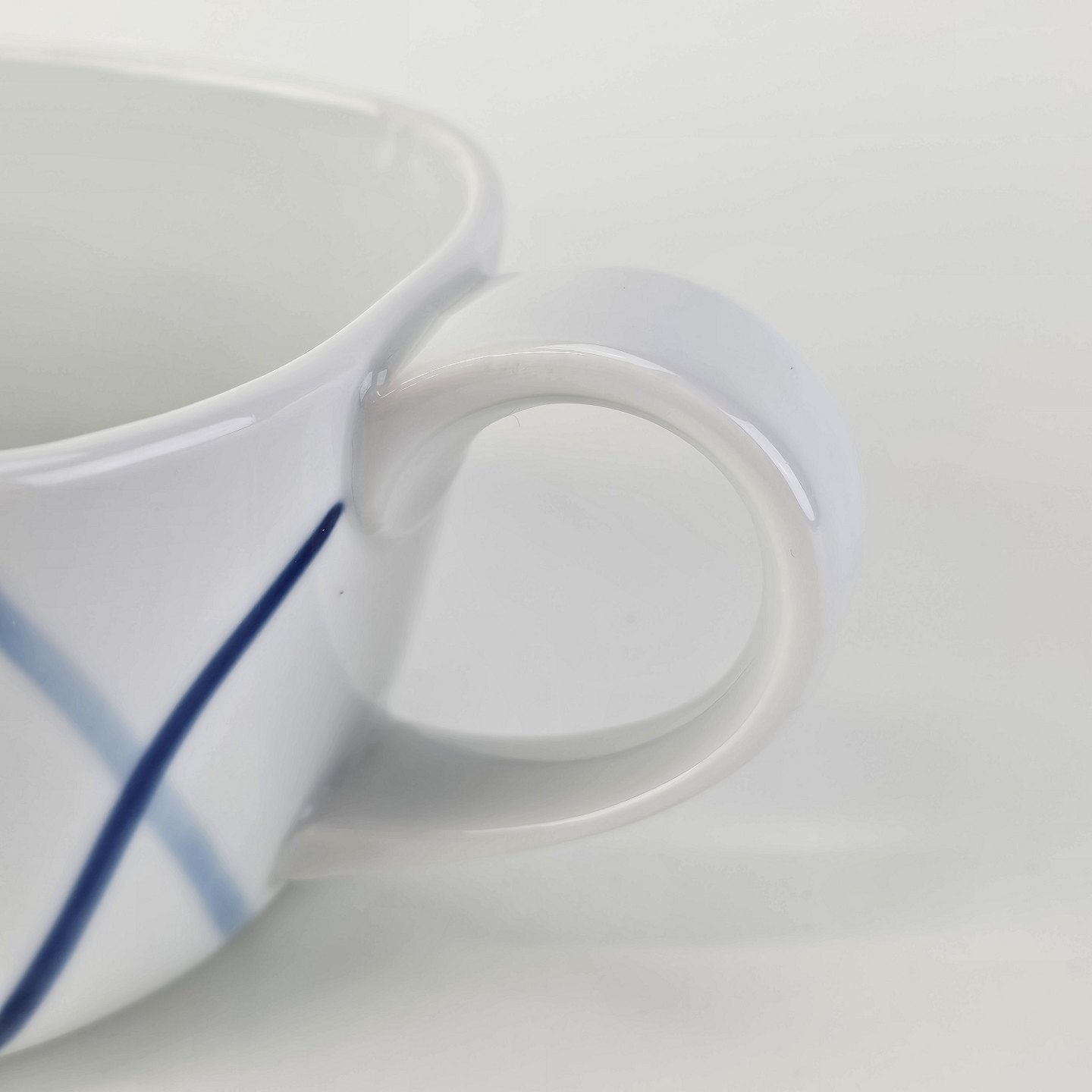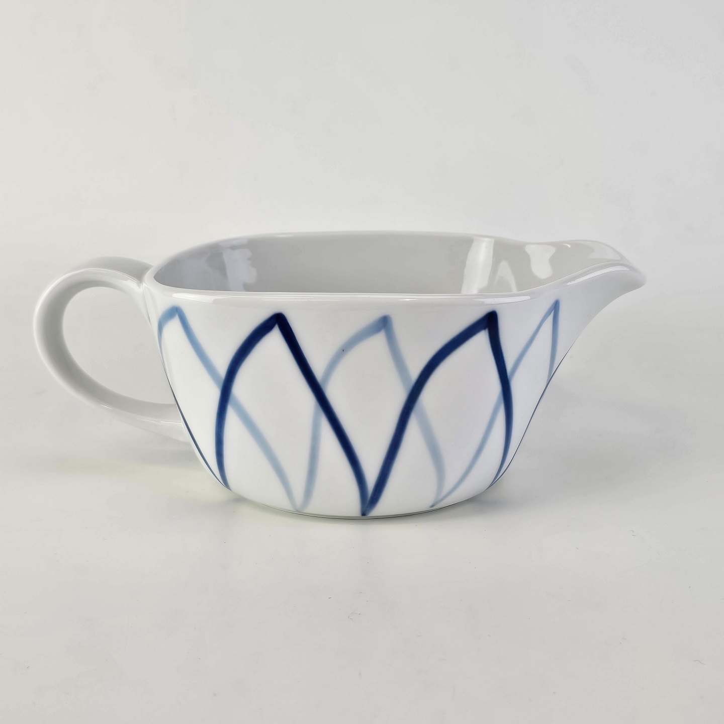Blå Flamme er hvidt ildfast porcelæn dekoreret med blå striber, der ligner flammer.