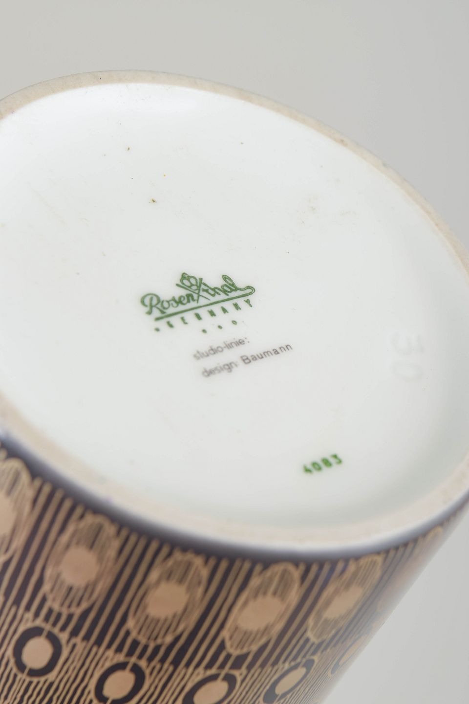 Baumann var en formgiver tilknyttet Rosenthal i slutningen af det 20. århundrede og arbejdede med dekorative porcelænsobjekter præget af geometriske mønstre og raffineret overfladebehandling. Rosenthal blev grundlagt i 1879 og er kendt for sit samarbejde med kunstnere og designere, hvilket har gjort virksomheden til en central aktør inden for europæisk porcelænsdesign.
