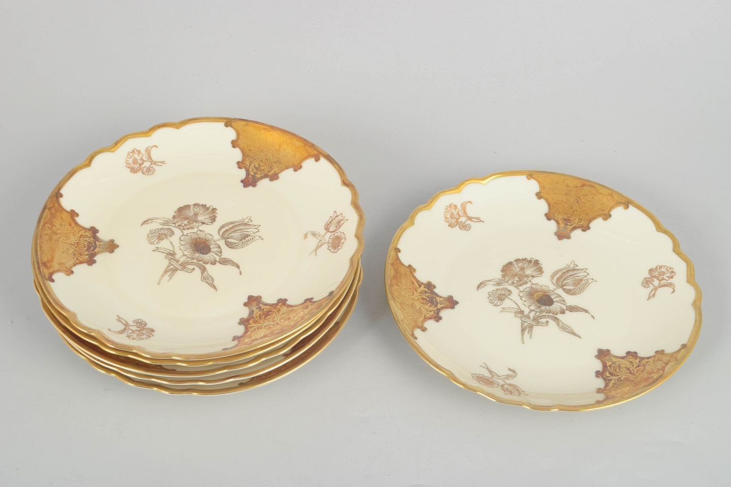 Elegante porcelænstallerkener med reliefpræget elfenbensfarvet glasur og rigt forgyldt rand samt klassisk blomsterdekoration, produceret i Tyskland i mellemkrigstiden.