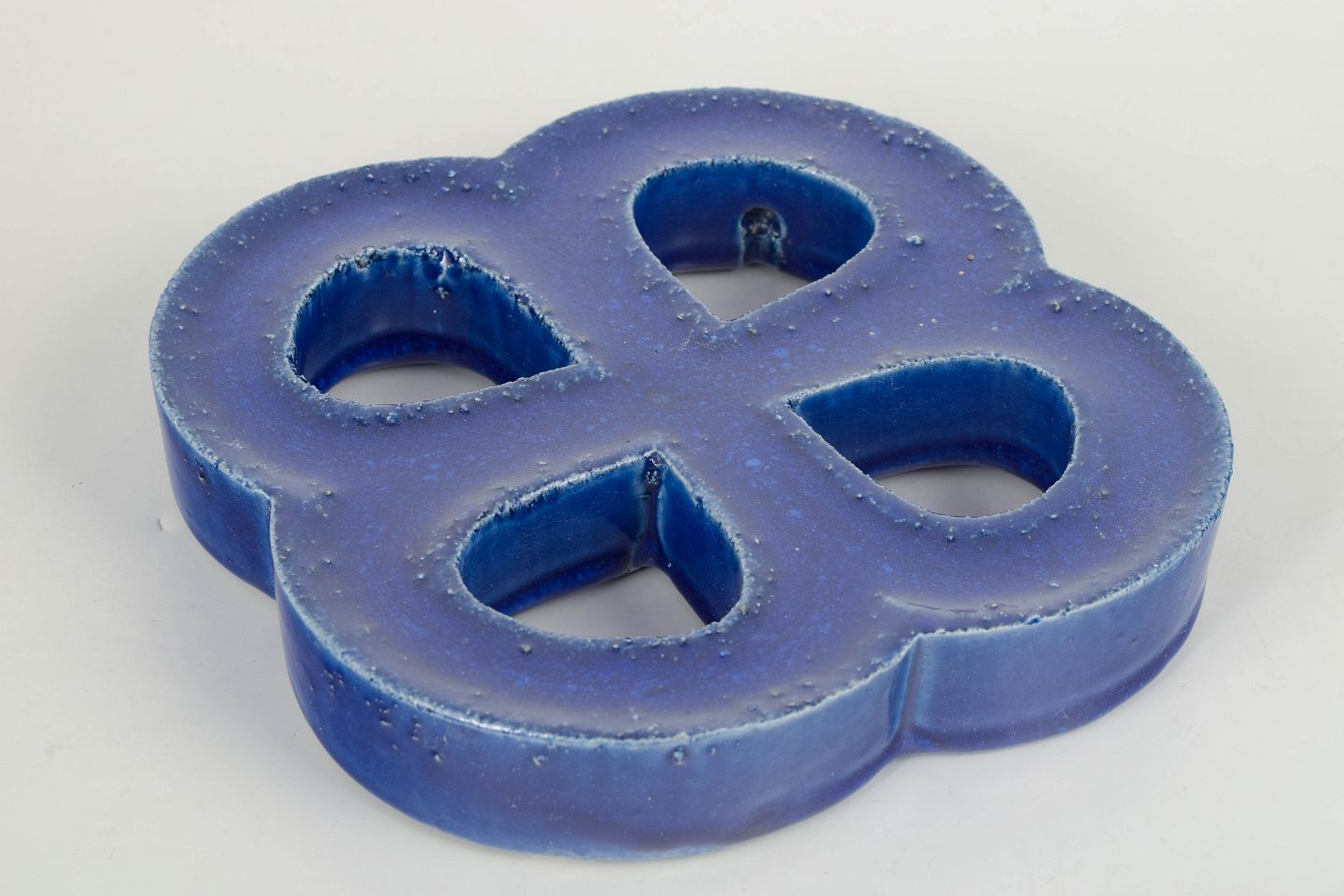 Dekorativt vægrelief i stentøj med organisk firkløverform og gennemgående åbninger. Udført med dyb blå, levende glasur med bobleeffekt og variation i overfladen. Bagside med hul til ophæng.