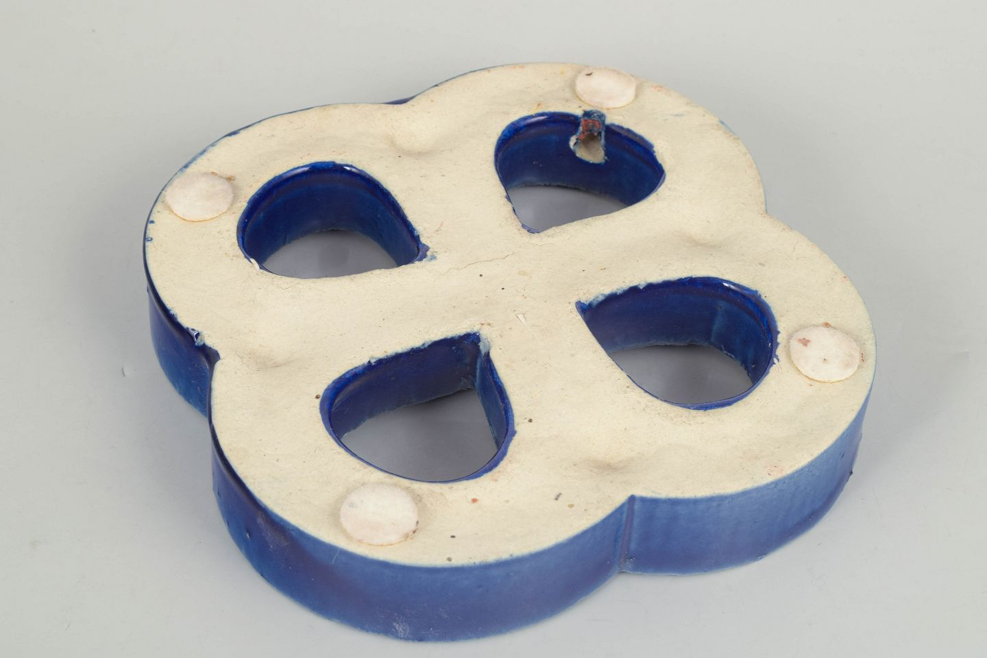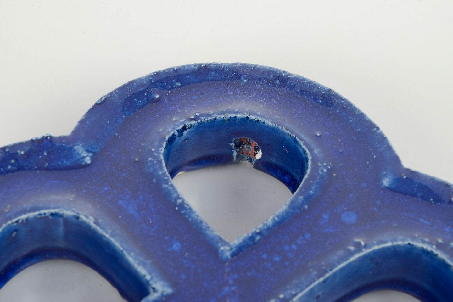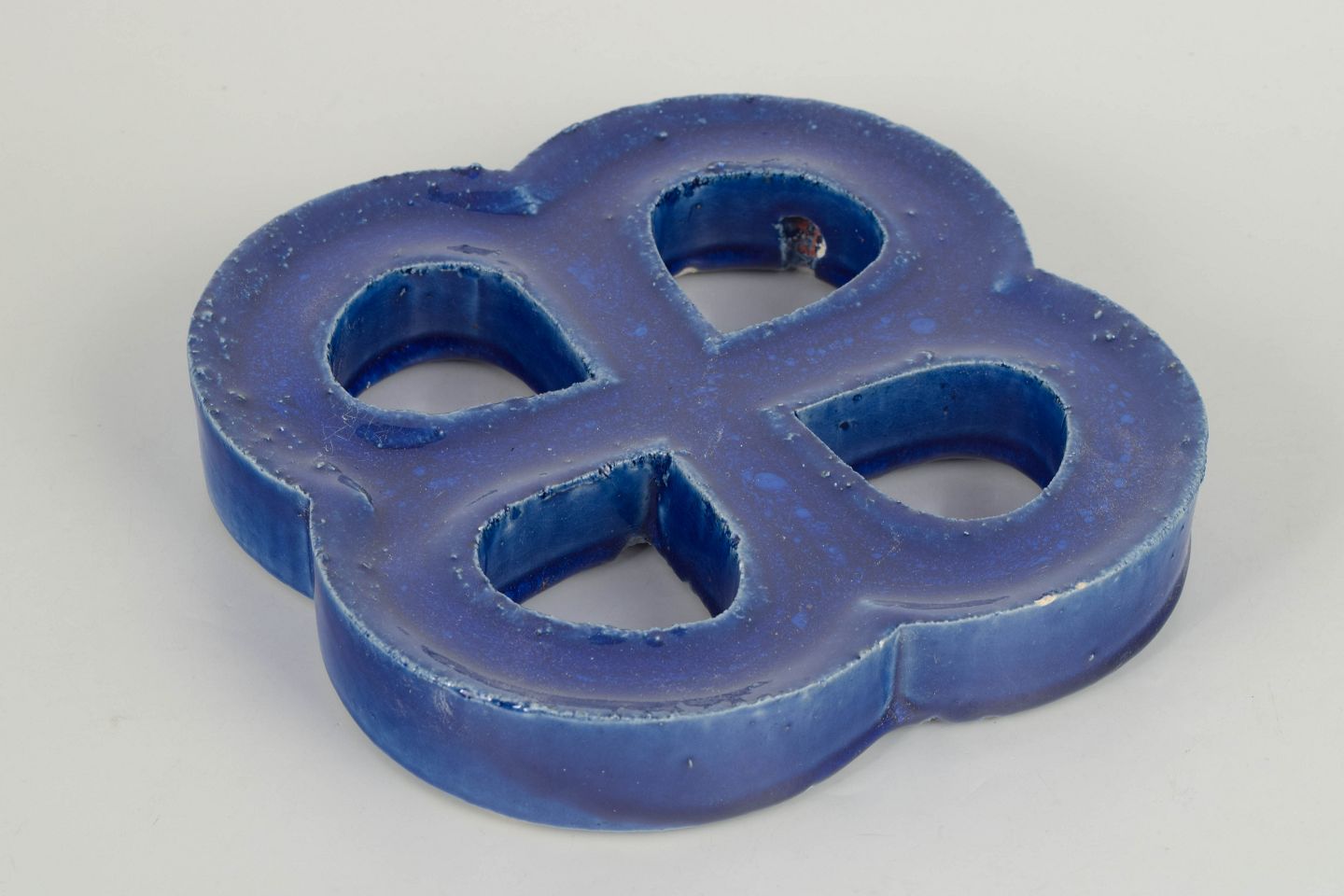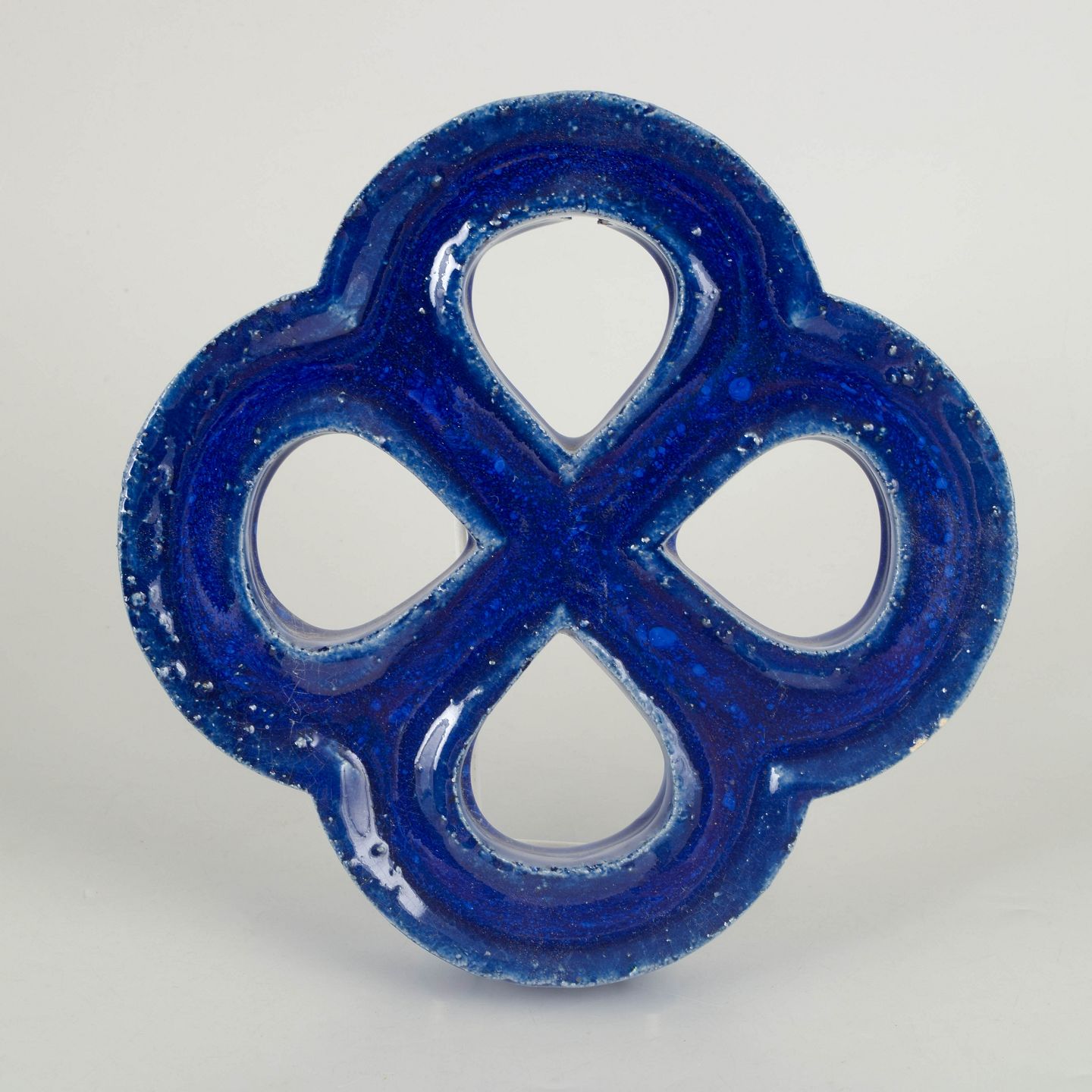 Dekorativt vægrelief i stentøj med organisk firkløverform og gennemgående åbninger. Udført med dyb blå, levende glasur med bobleeffekt og variation i overfladen. Bagside med hul til ophæng.