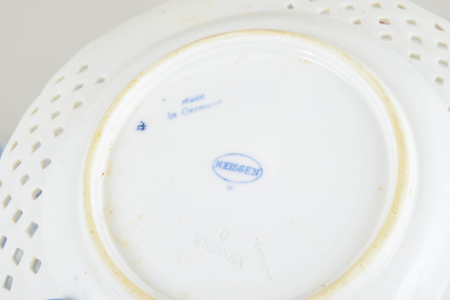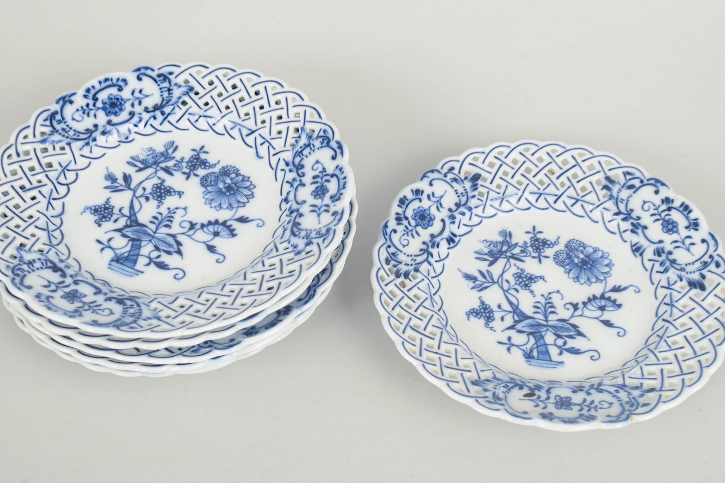 Klassiske salattallerkener i porcelæn med gennembrudt fane og blå løgmønstret dekoration i underglasur. Traditionelt håndmalet udtryk med fin detaljering.