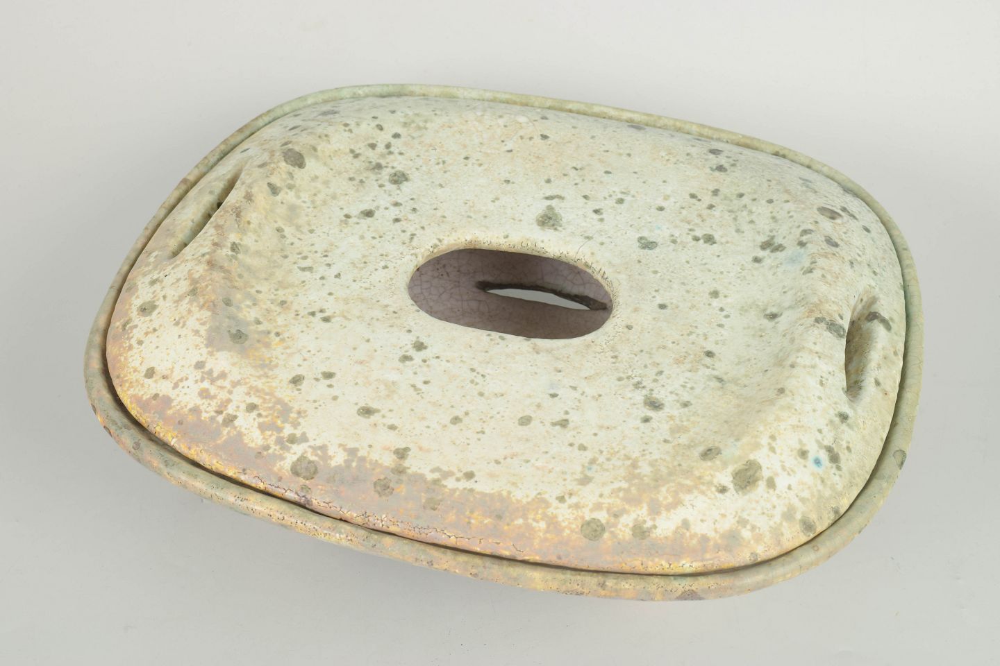 Organisk formet lågskål i stentøj med karakteristisk plettet glasur i lyse, jordnære toner. Skulpturel form med bløde linjer og låg med åbning, typisk for Hans Hedbergs keramiske arbejder fra Biot.