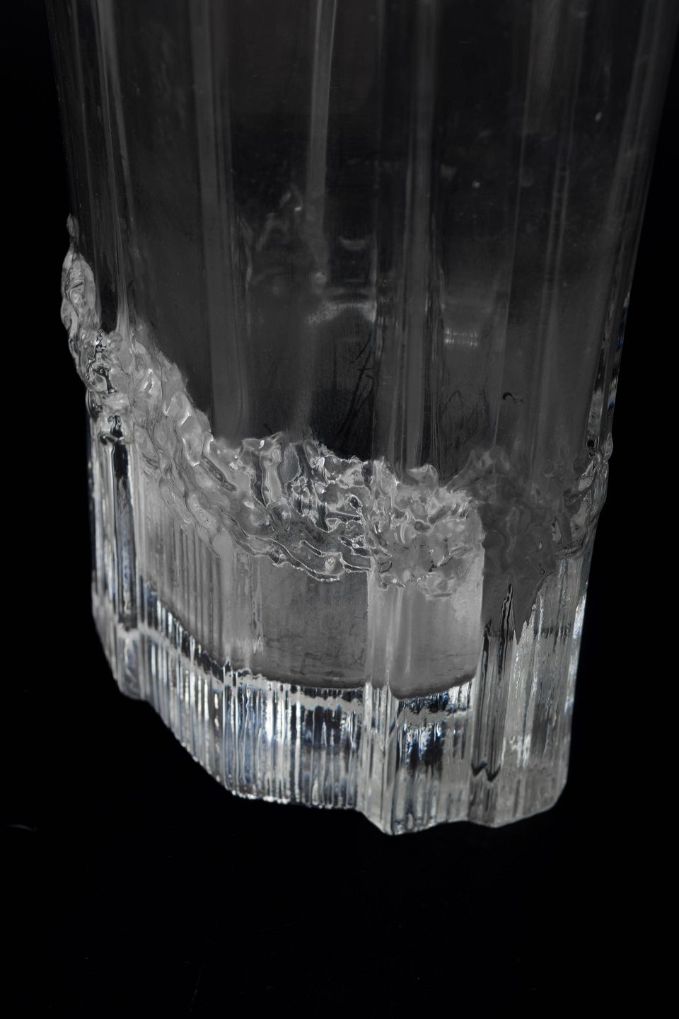 Klar glasvase med karakteristisk is-struktureret bælte omkring midten og lodrette slebne flader. Organisk form med let bølget kant.