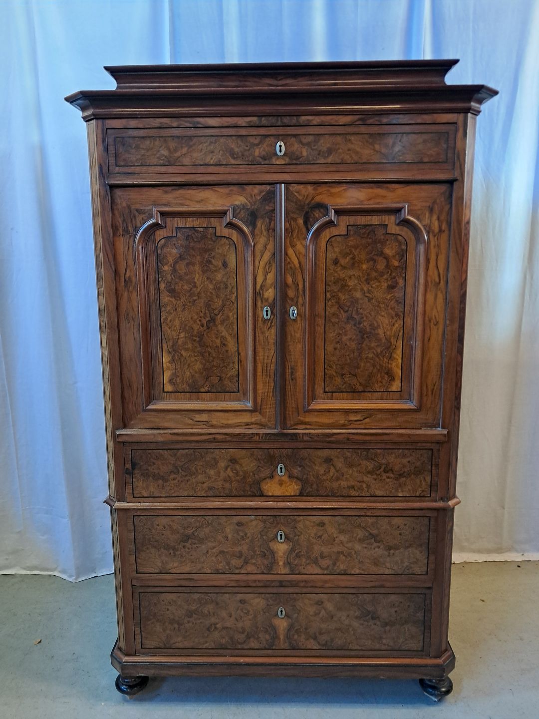 Skab i fineret mahogni og nøderod, fra 1900erne.