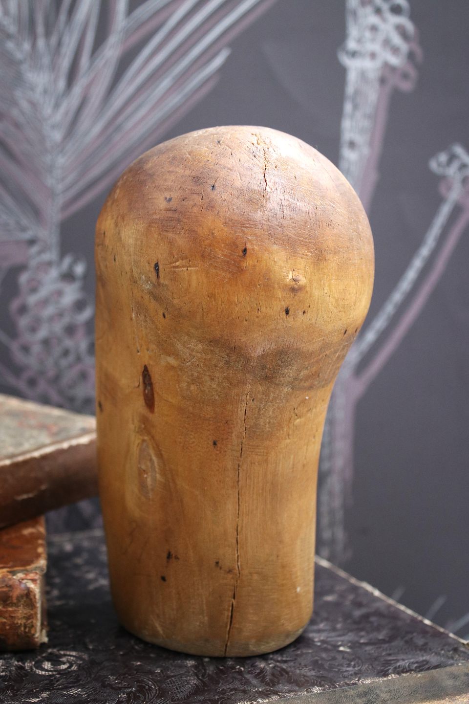 Dekorativt , antikt mini hatte hoved i udskåret træ med en rigtig fin patina...