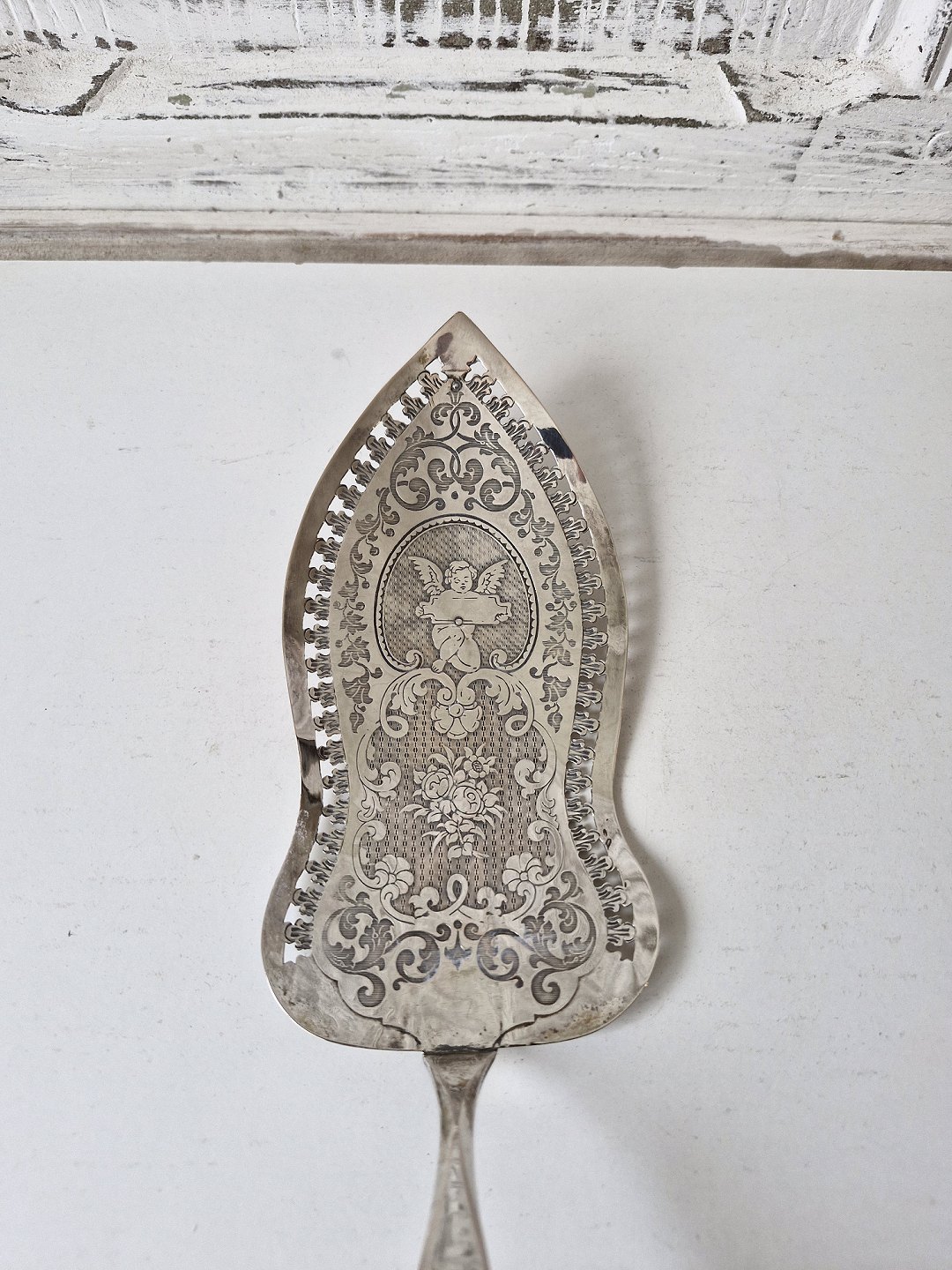 Stor fiskespade i sølv med perlemors håndtag. Sølv laf med gennembrudt kant, smukt dekoreret med en engel og blomster. Perlemors håndtaget er smukt udskåret med en påugl.