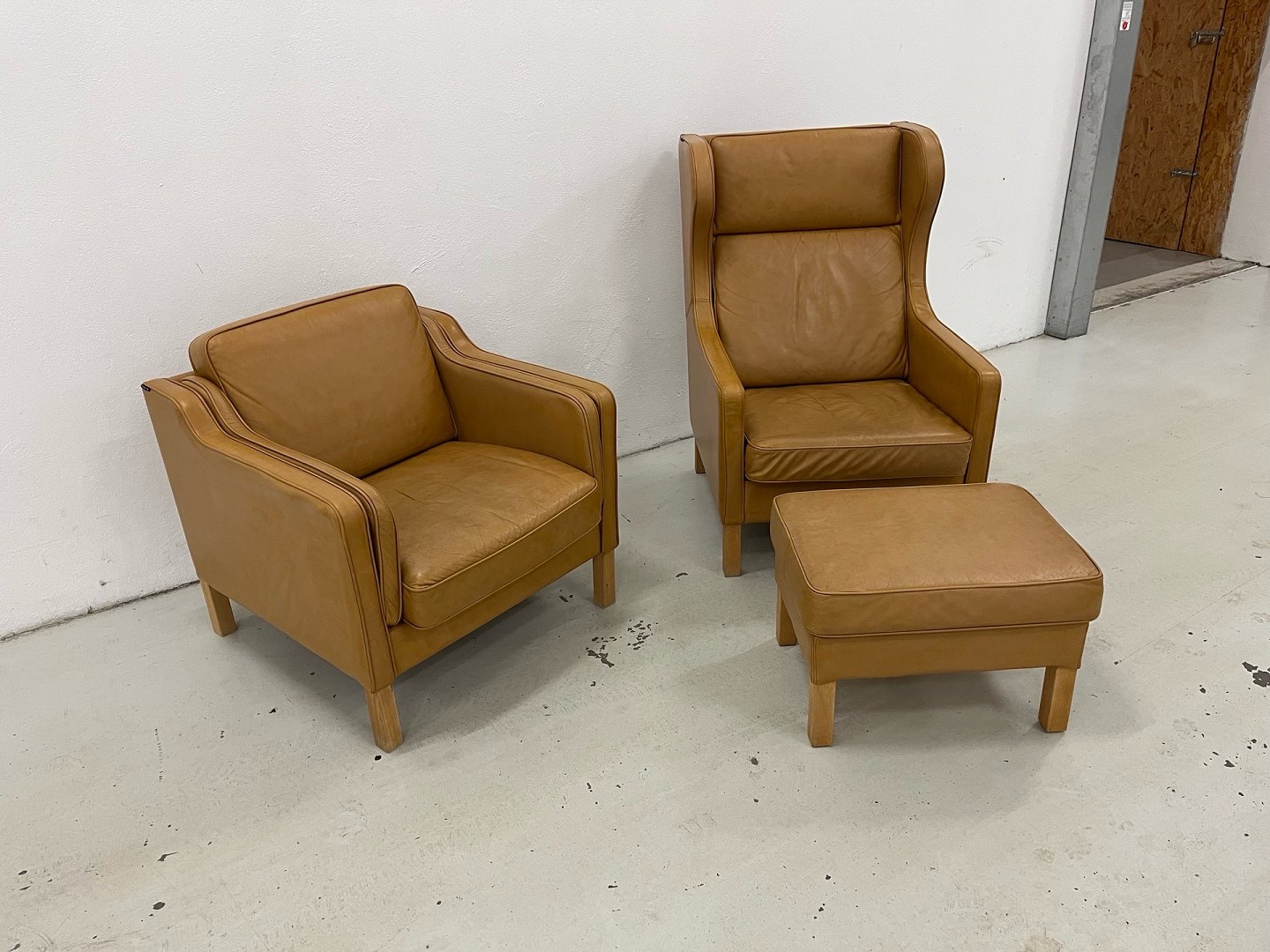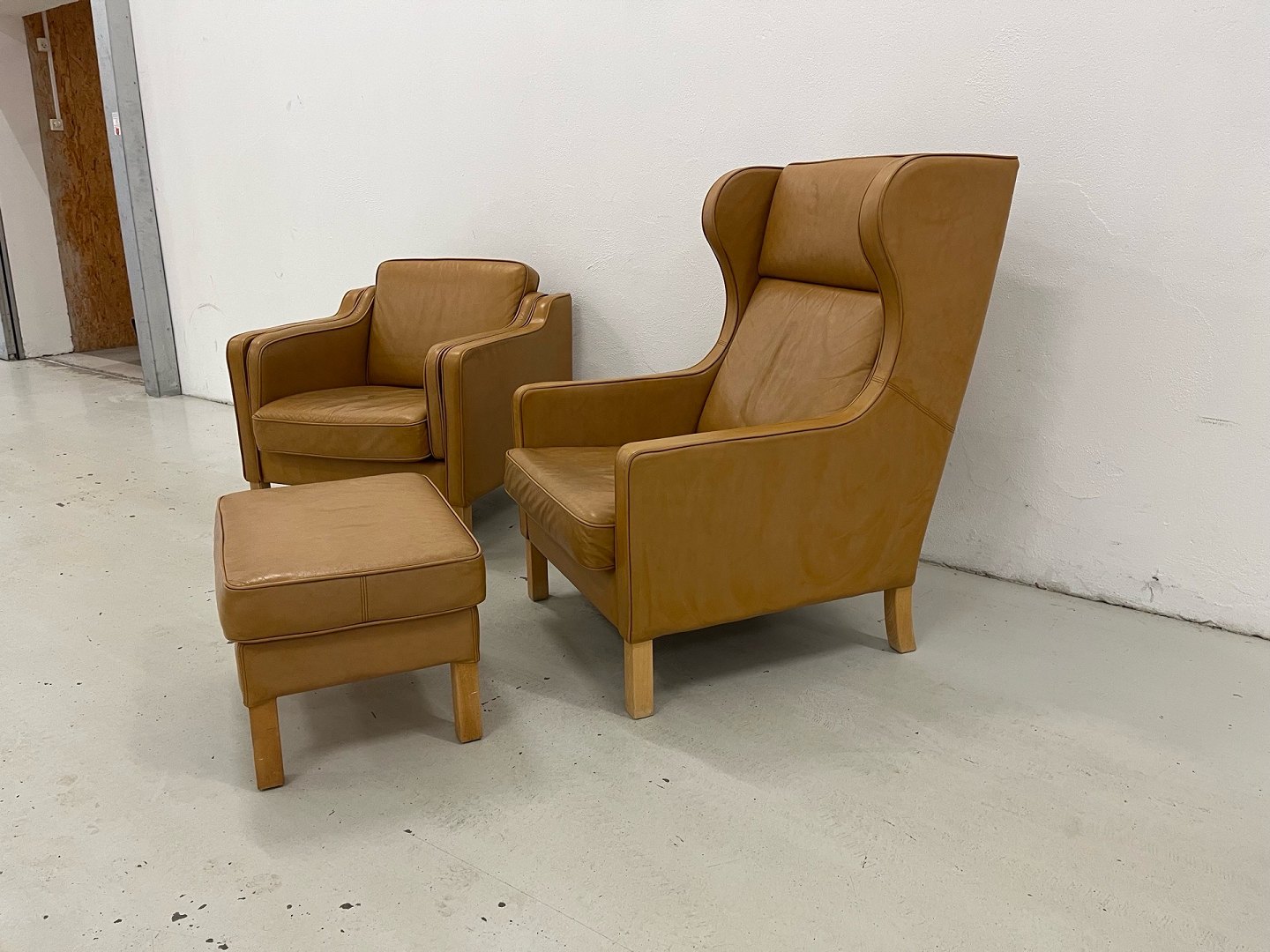 Eksklusivt sæt bestående af Skalma Cerena øreklapstol, lav stol og skammel, udført i semianilin cognacfarvet læder (668/08) med ben i lys sæbebehandlet bøg.