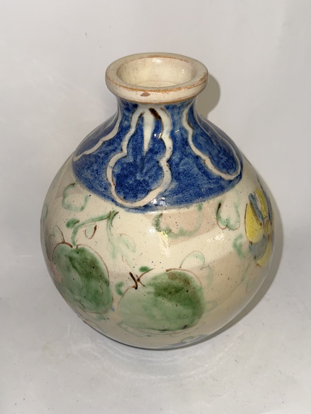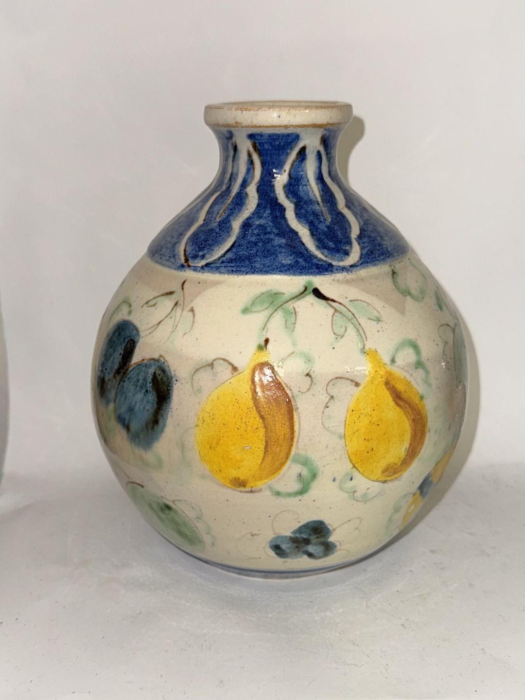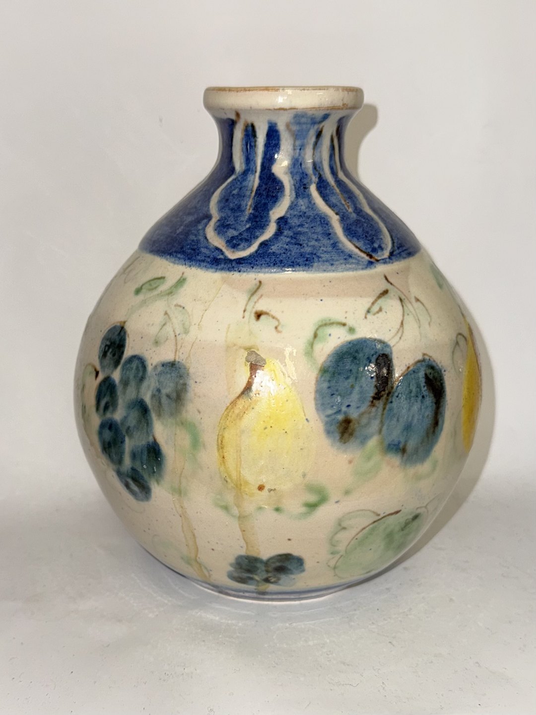 Vase i keramik (lertøj) med frugt motiv. Tilskrives Anders Høy fremstillet i begyndelsen af 1930’erne. Lille plet med manglende glasur (ikke et skår) på kanten øverst. Mindre, cirkelrund, glasur mangel ved et æble (se foto). Fin dekoration af forskellige frugter bl.a druer og æbler. Typisk Anders Høy stil. H. 18 cm.