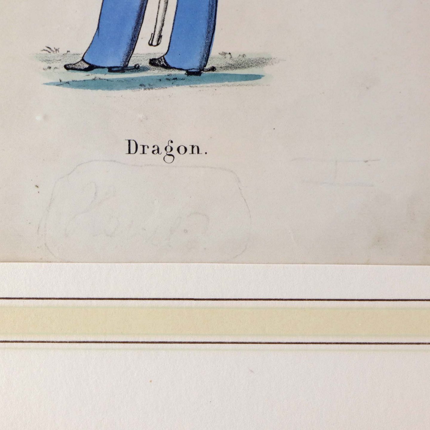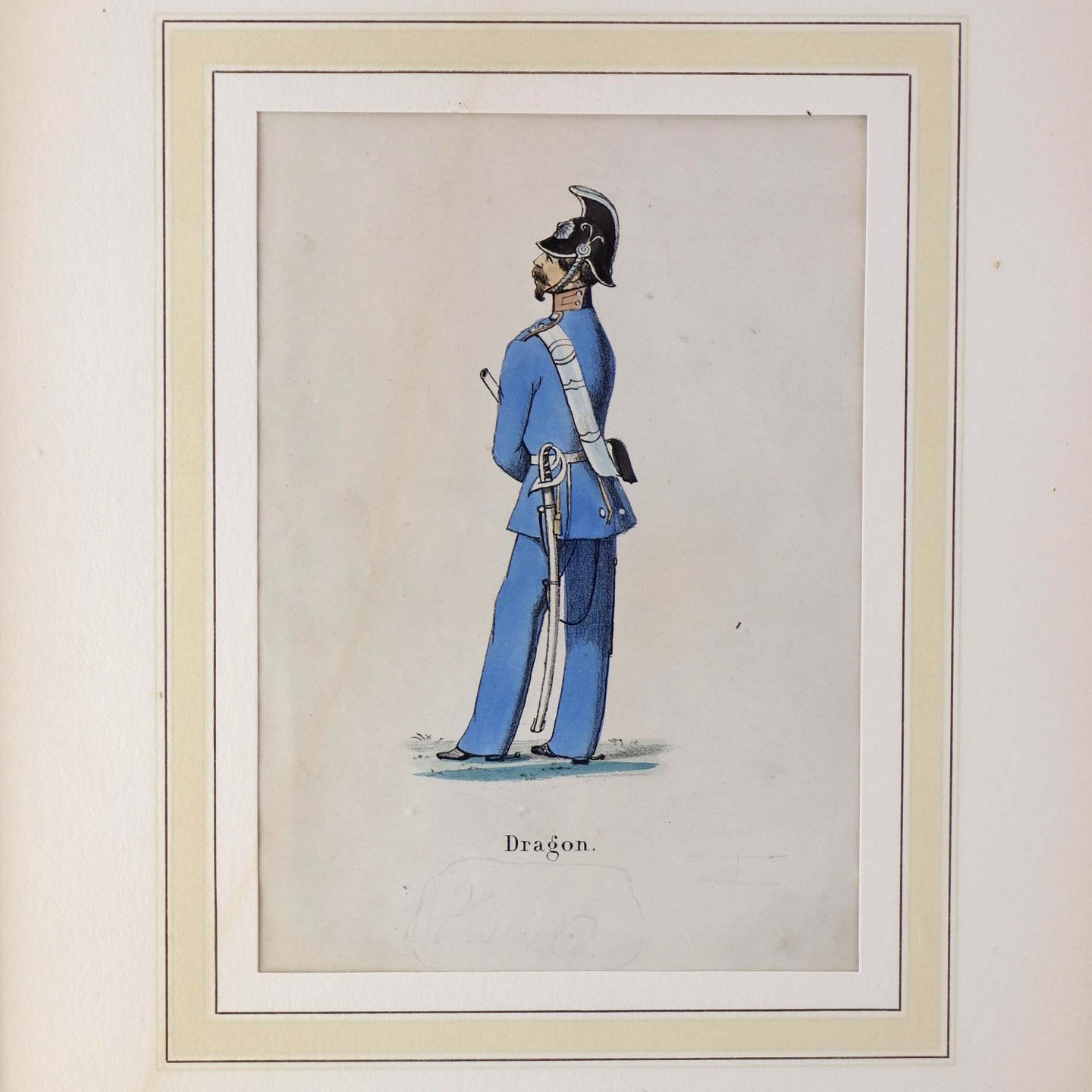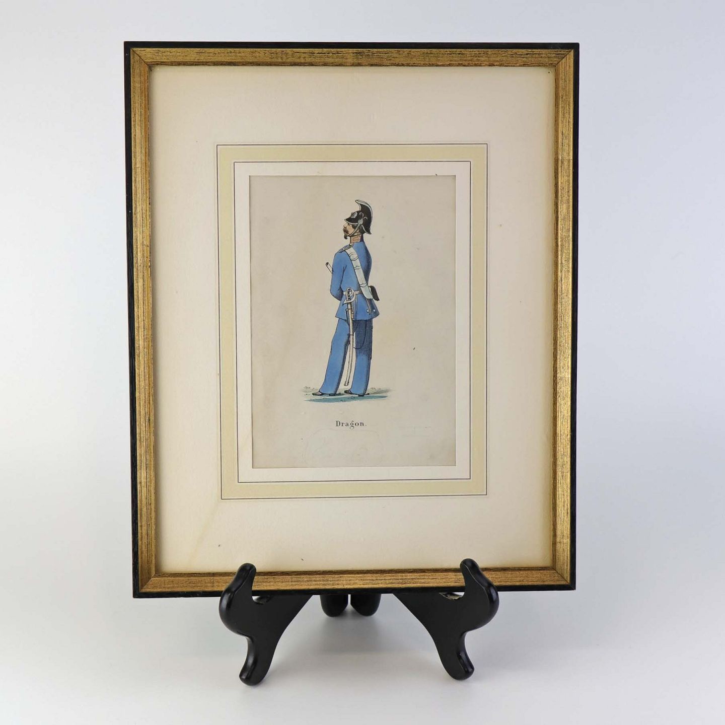 Text available in Danish: Originalt kobberstik fra år 1858 i træramme med teksten Dragon og motiv af en soldat i blå uniform.