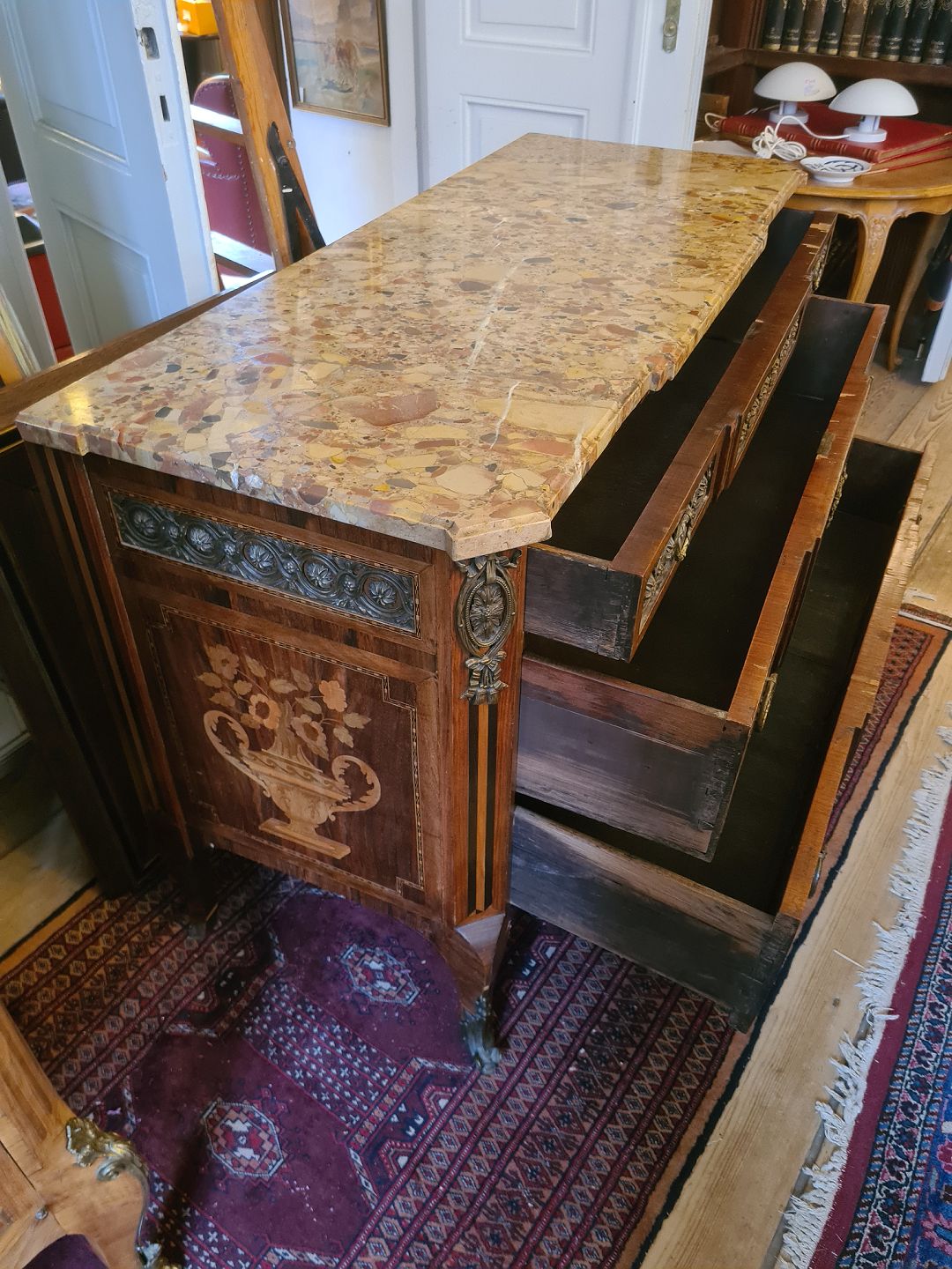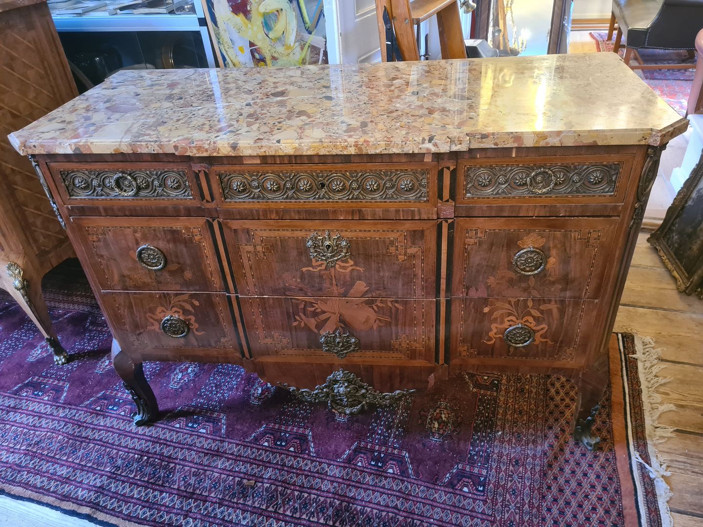 Antik kommode fra sidst i 1800 tallet i rokokostil med løstliggende marmorplade på toppen. Fremstår pæn og funktionsdygtig dog med enkelte finér skader øverst på skufferne (billede) og umiddelbart uden nøgle.