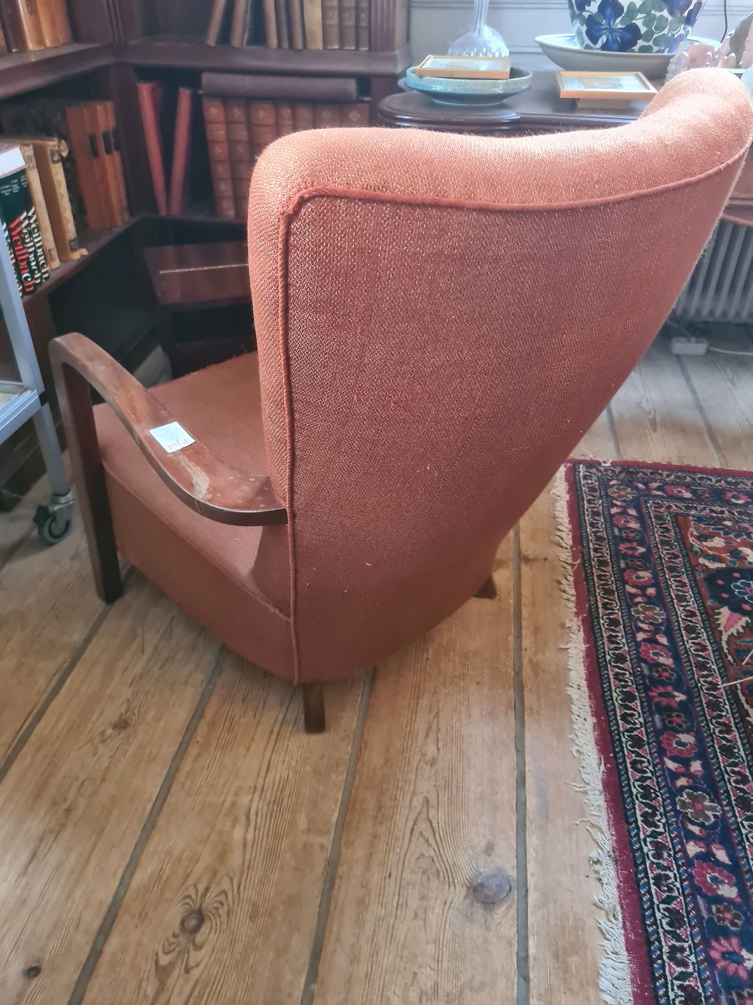 Snedkermester lænestol fra 1960'erne i Cuba mahogni med stofbetrukket ryg og sæde. Fremstår god og stabil men med lettere brugsspor på især venstre armlæn og sæde. (Billede)